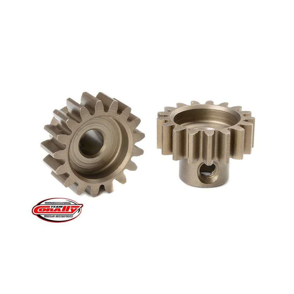 Rövid változat, anyaga edzett acél, 17 fog, fogmodul M1.0. 5,0 mm átmérőjű motortengelyhez. A TEAM CORALLY fogaskerekek marással készülnek, majd edzettek, ami nagy fogaskerék pontosságot biztosít. Minden TEAM CORALLY fogaskerék az EU-ban készül.Více informací