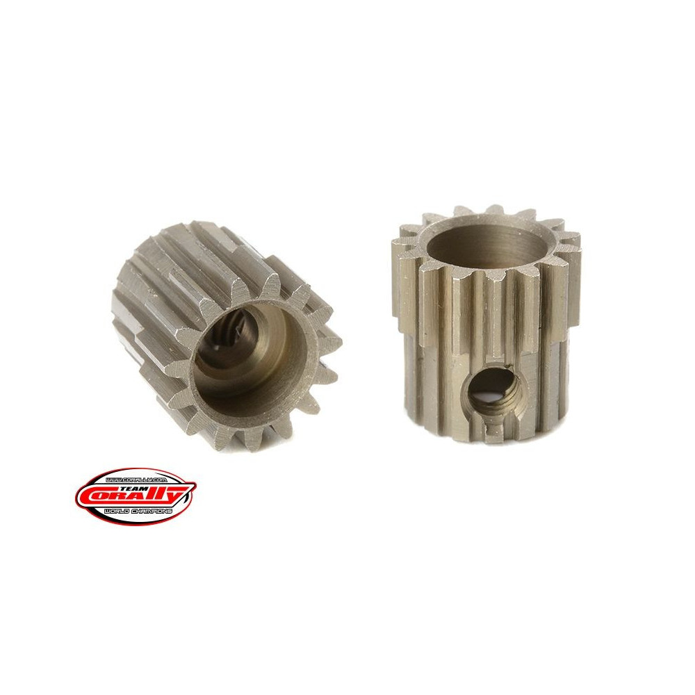 Rövid változat, anyaga edzett acél, 15 fog, fogmodul 48DP. 3,17 mm (1/8 in) átmérőjű motortengelyhez. A TEAM CORALLY fogaskerekek marással készülnek, majd edzettek a nagy pontosságú fogaskerekek biztosítása érdekében. Minden TEAM CORALLY fogaskerék az EU-ban készül.Více informací