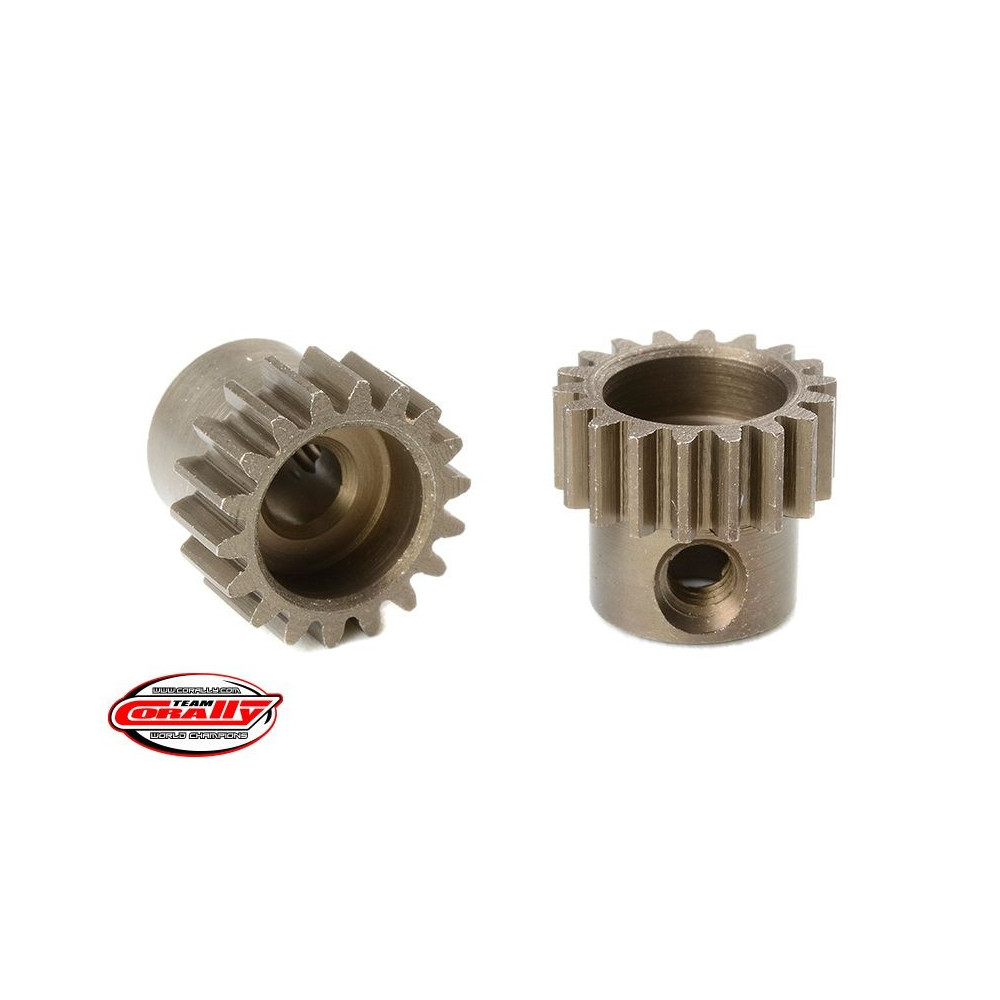 Rövid változat, anyaga edzett acél, 18 fog, fogmodul 48DP. 3,17 mm (1/8 in) átmérőjű motortengelyhez. A TEAM CORALLY fogaskerekek marással készülnek, majd edzettek a nagy pontosságú fogaskerekek biztosítása érdekében. Minden TEAM CORALLY fogaskerék az EU-ban készül.Více informací