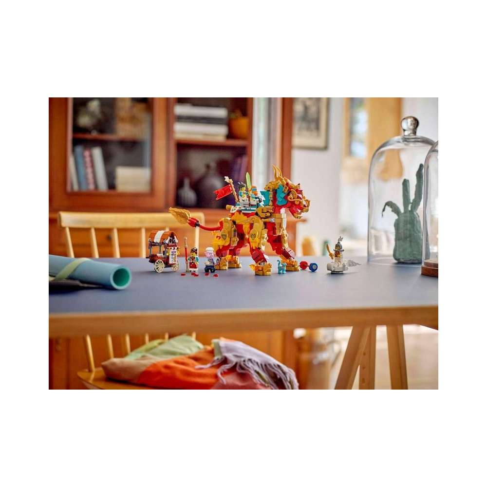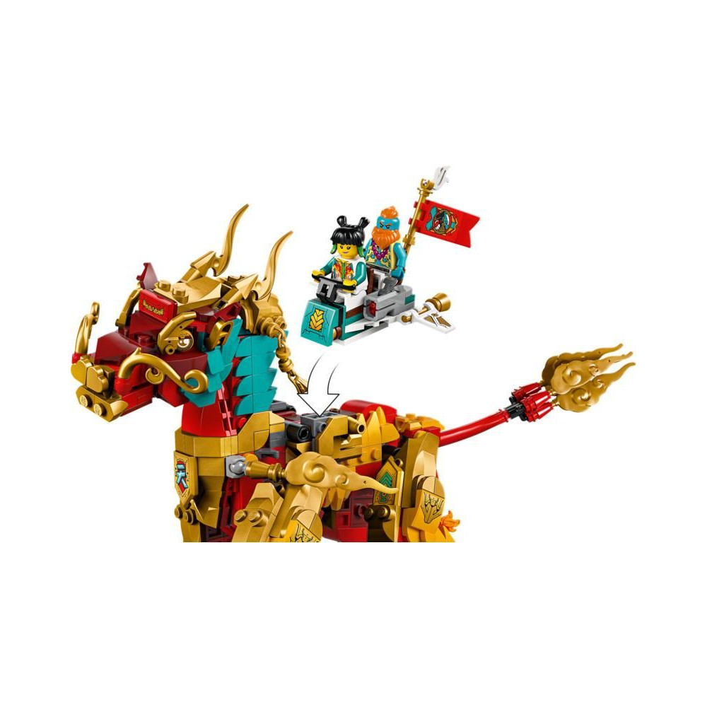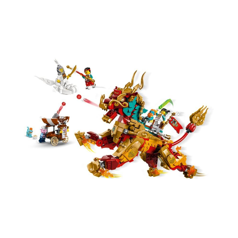 - Vidám készlet – Ez a LEGO® Monkie Kid™ készlet tartalmaz egy mozgatható, aranypáncélos sárkányló figurát, 5 minifigurát, egy ételszállító kocsit, egy „lebegő” felhőt, egy kétszemélyes repülőgéppé alakítható nyerget és még sok mást.