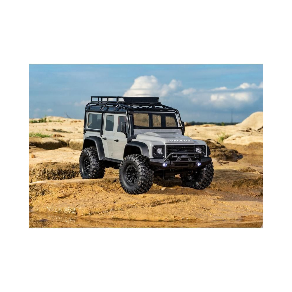 A Traxxas TRX-4M Land Rover Defender RC modellje 1:18 méretarányban, elképesztő sokoldalúsággal és képességekkel. Fém alvázkeret 4 pontos felfüggesztéssel, olajos lengéscsillapítókkal, 45°-os kormányszöggel, licencelt klipszes karosszériával, LED világítással a lökhárítóban. 2S LiPo akkumulátor és USB töltő.