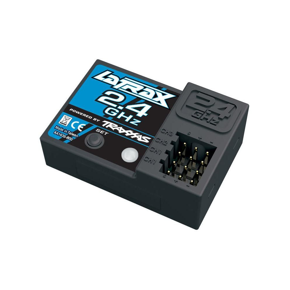 A Latrax háromcsatornás 2,4 GHz-es vevője biztonságos, megszakításmentes vezetést biztosít. Egyszerű, egygombos párosítás. Állapotjelzés a LED-ek.