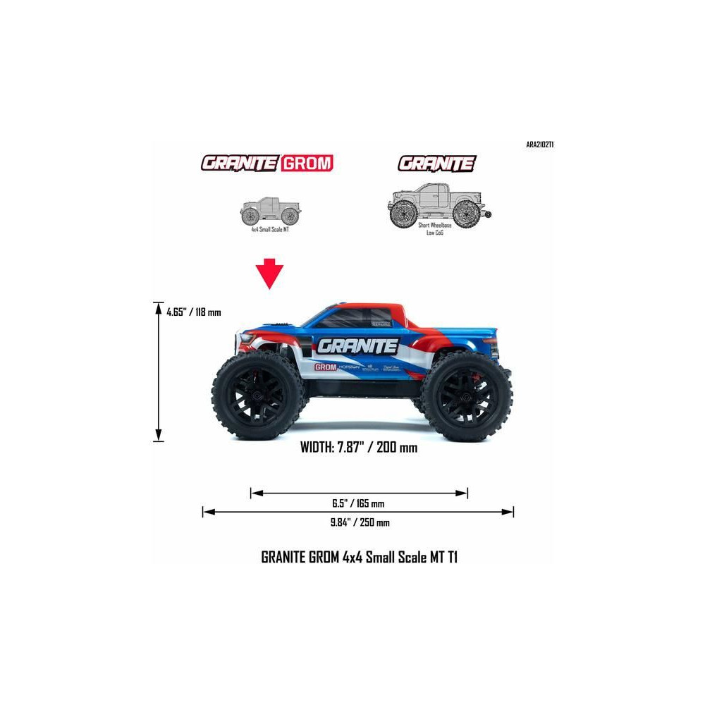 Az ARRMA GRANITE GROM 4X4 Monster Truck 1:18 RTR az ARRMA RC autóktól elvárható magas színvonal, tartósság és teljesítmény szerint lett tervezve és gyártva. Csak egy kicsit kisebb!
