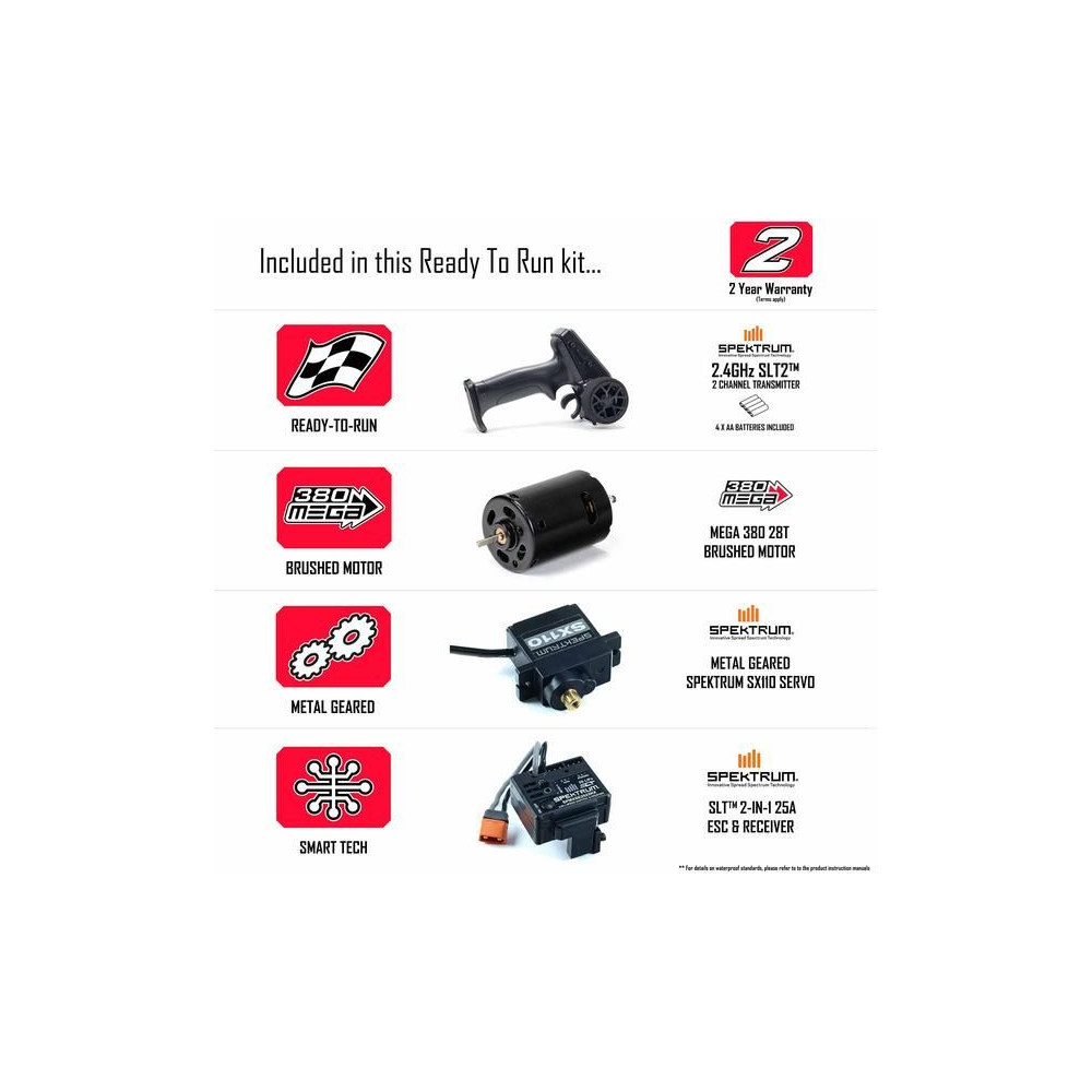 Az autó jól fel van készítve a vezetés viszontagságaira, első és hátsó lengéscsillapító lökhárítókkal, amelyek az erős kompozit alvázba vannak szőve. A robusztus fém fogaskerekekkel ellátott 4WD sebességváltó a MEGA 380-as motortól a zárt hajtásláncon keresztül továbbítja az erőt a tartós dBoots® FORTRESS™ monster truck kerekekhez és gumikhoz. Még a Spektrum™ SX110 kormányszervó is fém fogaskerekekkel rendelkezik, és az IC2® csatlakozóval felszerelt Spektrum SLT™ 2 az 1-ben 25A vevő/vezérlőhöz hasonlóan vízálló* a vizes vezetéshez.