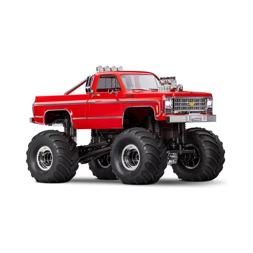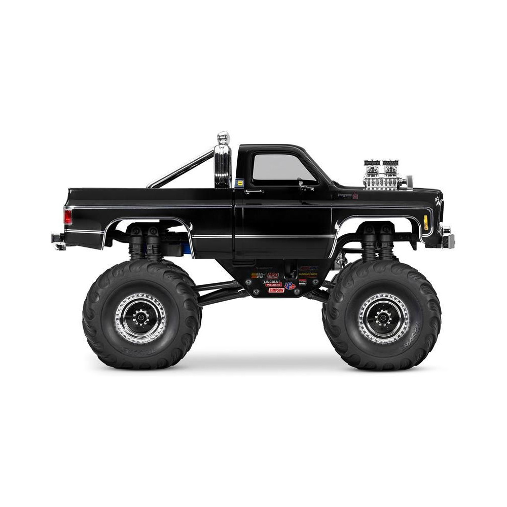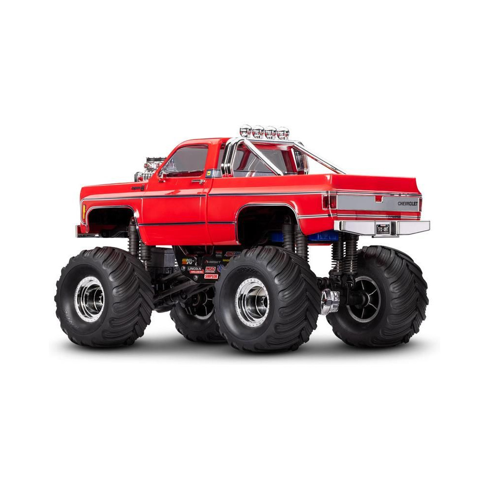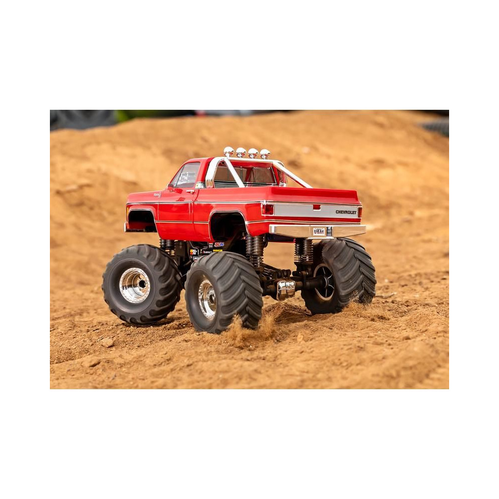 RC modell a Traxxas TRX-4MT Chevrolet K10 kiadásában Monster Truck nagyobb hasmagassággal, óriási kerekekkel4 pontos felfüggesztés, kettős olajos lengéscsillapítók, fém szervóművek, 45°-os kormányszög, klipszes karosszéria, LED fényszórók. 2S LiPo akkumulátor és USB töltő.