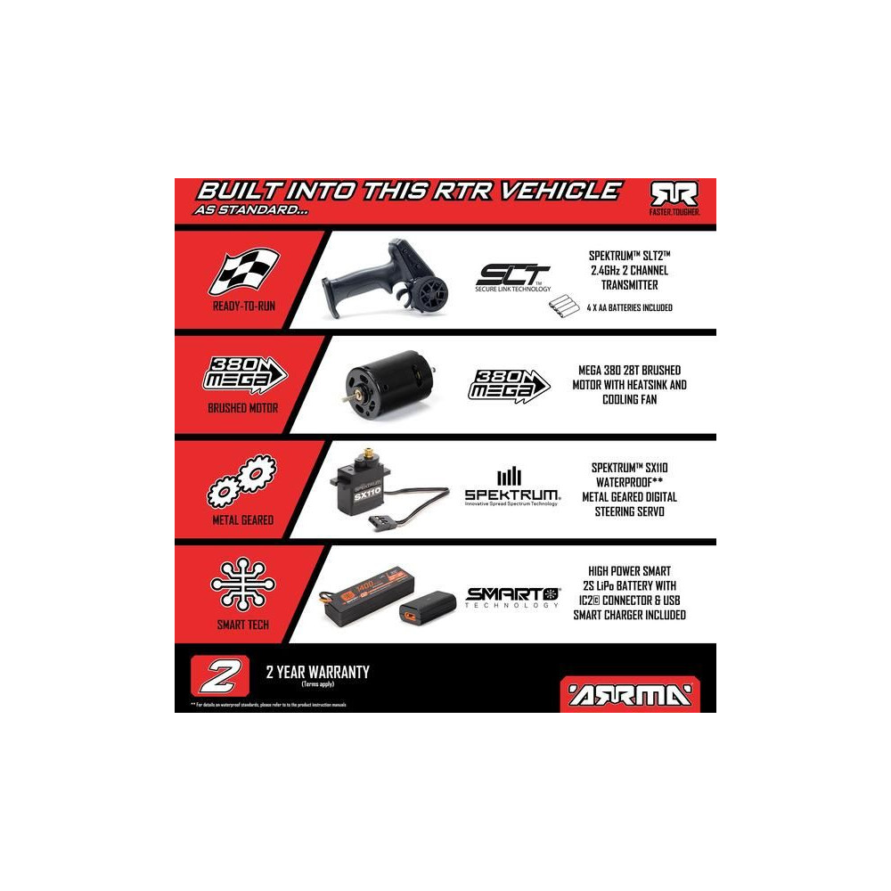 Az autó kiválóan fel van készítve az igényes vezetési élményre, megerősített kompozit alvázzal, autentikusan megemelt oldalfalakkal, független felfüggesztéssel, olajlengések és összkerékhajtás jellemzi. A robusztus fém differenciálművek zárt hajtásláncon keresztül továbbítják az erőt a MEGA 380 DC motorról a nagyméretű dBoots Chevron MT kerekekhez és gumiabroncsokhoz. Még a Spektrum™ SX110 szervomotor is fém fogaskerekekkel rendelkezik, és a Spektrum SLT™ 2 az 1-ben 25A vevőhöz/vezérlőhöz hasonlóan, amely IC2® csatlakozóval van felszerelve, vízálló* nedves vezetési körülmények között. Az integrált hűtő és ventilátor alacsonyan tartja a motor hőmérsékletét a hosszú élettartam és a csúcsteljesítmény érdekében. Pótalkatrészekkel együtt opcionális tuning alkatrészek is kaphatók a modellhez a tökéletesítés érdekében.