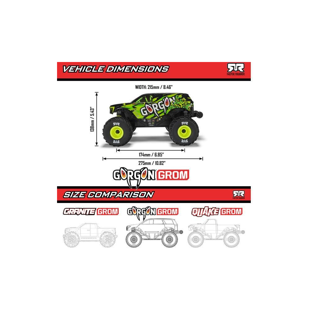Az ARRMA Gorgon Grom 4x4 1:16-ot ugyanolyan magas színvonalon, tartóssággal és teljesítménnyel tervezték és gyártották, mint amit az ARRMA RC autóktól elvársz. Csak egy kicsit kisebb!