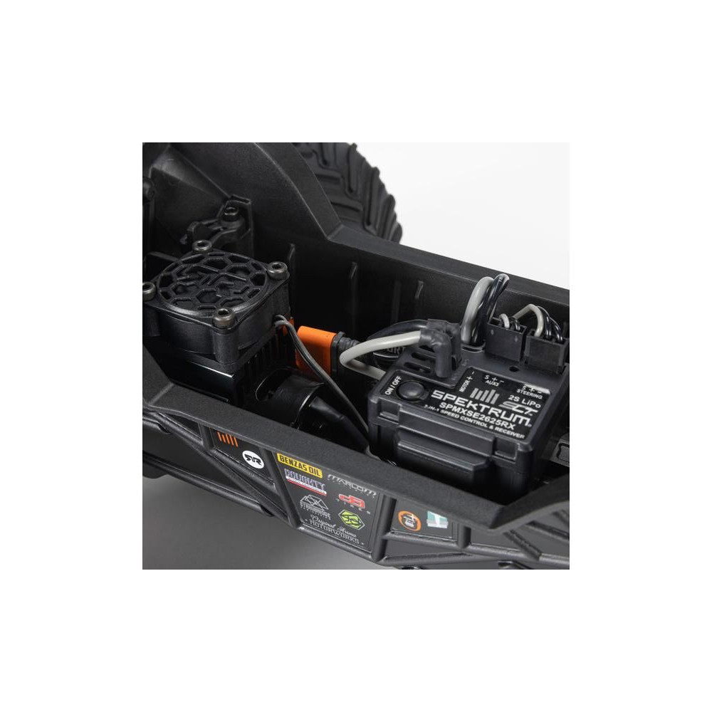 Az autó kiválóan fel van készítve az igényes vezetési élményre, megerősített kompozit alvázzal, autentikusan megemelt oldalfalakkal, független felfüggesztéssel, olajlengések és összkerékhajtás jellemzi. A robusztus fém differenciálművek zárt hajtásláncon keresztül továbbítják az erőt a MEGA 380 DC motorról a nagyméretű dBoots Chevron MT kerekekhez és gumiabroncsokhoz. Még a Spektrum™ SX110 szervomotor is fém fogaskerekekkel rendelkezik, és a Spektrum SLT™ 2 az 1-ben 25A vevőhöz/vezérlőhöz hasonlóan, amely IC2® csatlakozóval van felszerelve, vízálló* nedves vezetési körülmények között. Az integrált hűtő és ventilátor alacsonyan tartja a motor hőmérsékletét a hosszú élettartam és a csúcsteljesítmény érdekében. Pótalkatrészekkel együtt opcionális tuning alkatrészek is kaphatók a modellhez a tökéletesítés érdekében.