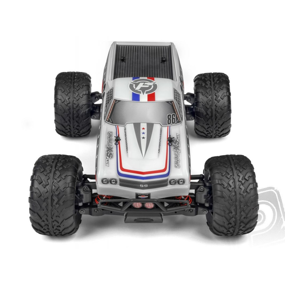 Savage XS 1:14-16-os modell méretarányban, Flux MMH-4000KV váltakozó áramú motorral, vízhatlan Flux EMH-3S szabályzóval ellátott. A kész modellhez tartozik 2,4Ghz RC szett, valamint karosszéria. (4x4-es kerékmeghajtás)