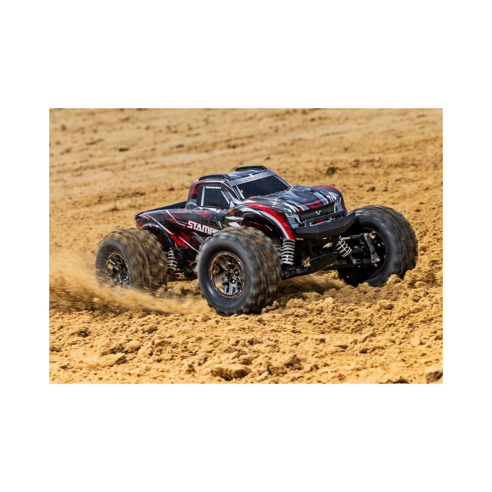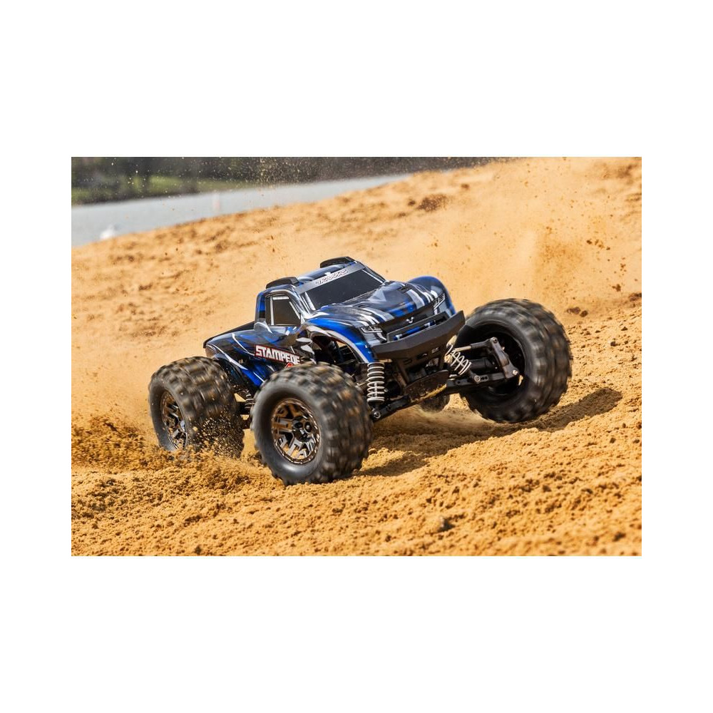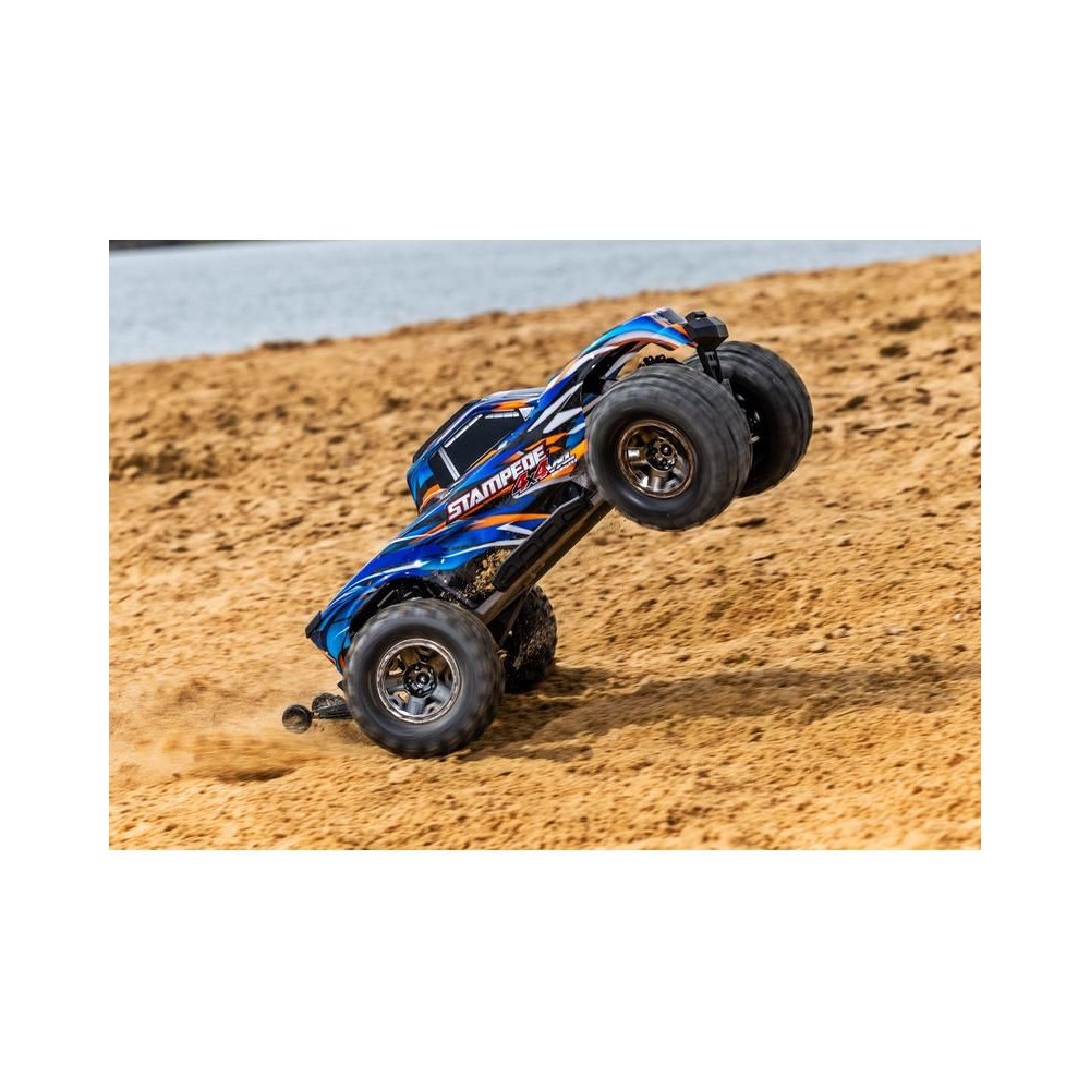 Traxxas Stampede VXL RC modell 1:10 méretarányban, 4x4 hajtással, túlméretezett 540XL kefe nélküli motorral, VXL-3S vezérlővel, akár 96 km/h sebességet is elérhet. Elektronikus menetstabilizátorral. Extreme Heavy Duty alkatrészek a nagy tartósság érdekében, gumírozott karosszériával és Sledgehammer gumiabroncsokkal.
