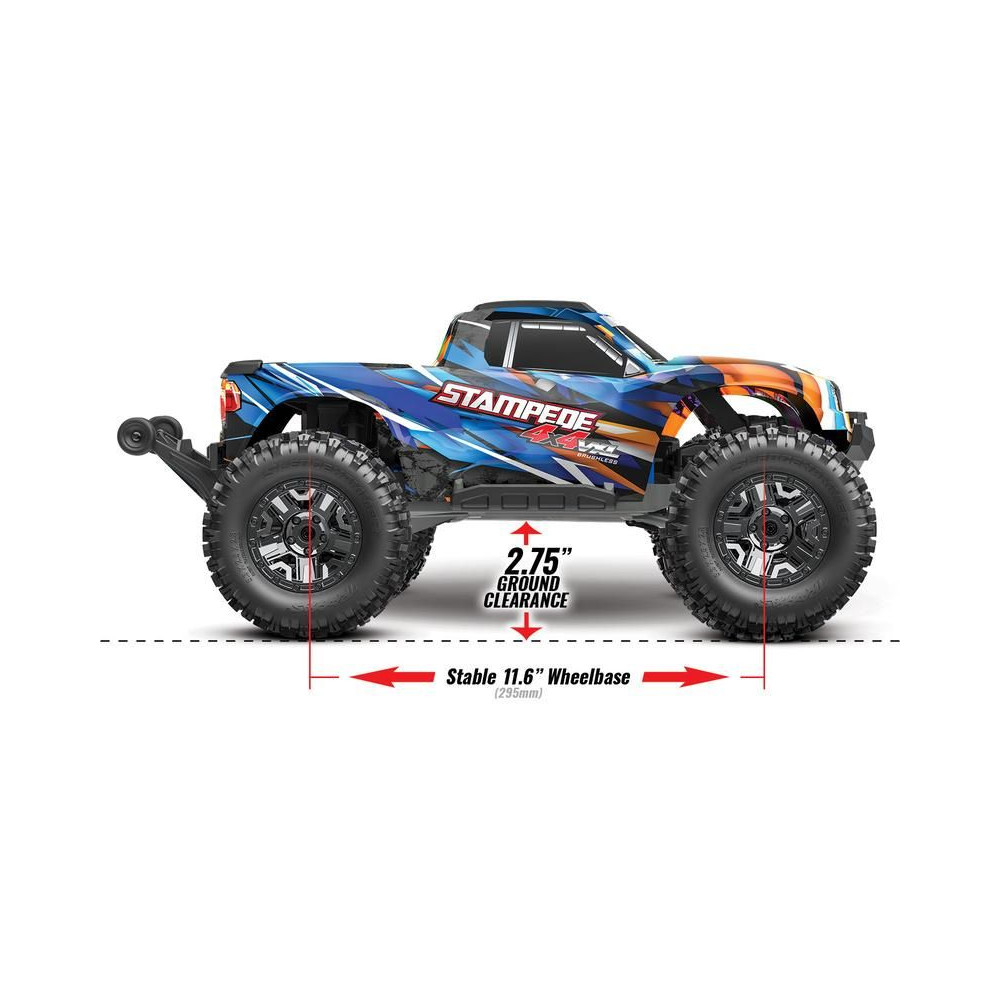 A Stampede 4x4 VXL RC modellautó visszatért - nagyobb és erősebb, mint valaha! A túlméretezett 540XL kefe nélküli motornak és a bevált VXL-3S vezérlőnek köszönhetően a modell játékosan és szórakoztatóan, akár 96 km/h sebességgel is átjut minden akadályon. A 4x4-es hajtás és a TSM elektronikus stabilitási rendszer hozzájárul a kiváló kezelhetőséghez. A nagy tartósság érdekében a Stampede gyárilag az Extreme Heavy Duty készlettel van felszerelve. A letisztult megjelenés és az egyszerű akkumulátorcsere érdekében gyorskioldású karosszéria rögzítő rendszert használnak. A kemény terepjáró kihívásokhoz SledgeHammer gumiabroncsokat használnak.
