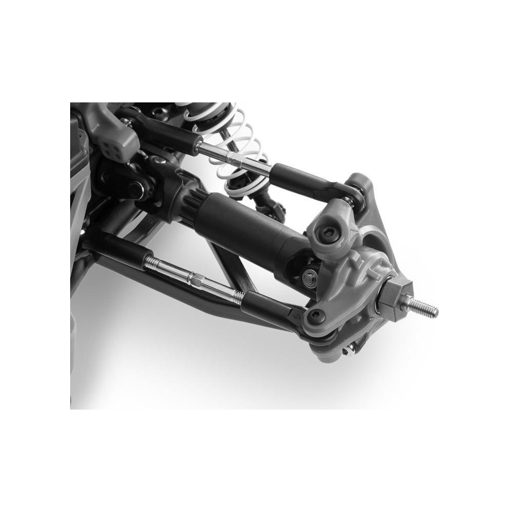 A hosszú karút elnyeli az éles ütéseket is, és javítja a modell kezelhetőségét. Minden helyzetben precíz és gyors kormányreakciót biztosít. A végtelen szórakozás érdekében állítható olajos lengéscsillapítók vannak a futóművön.
