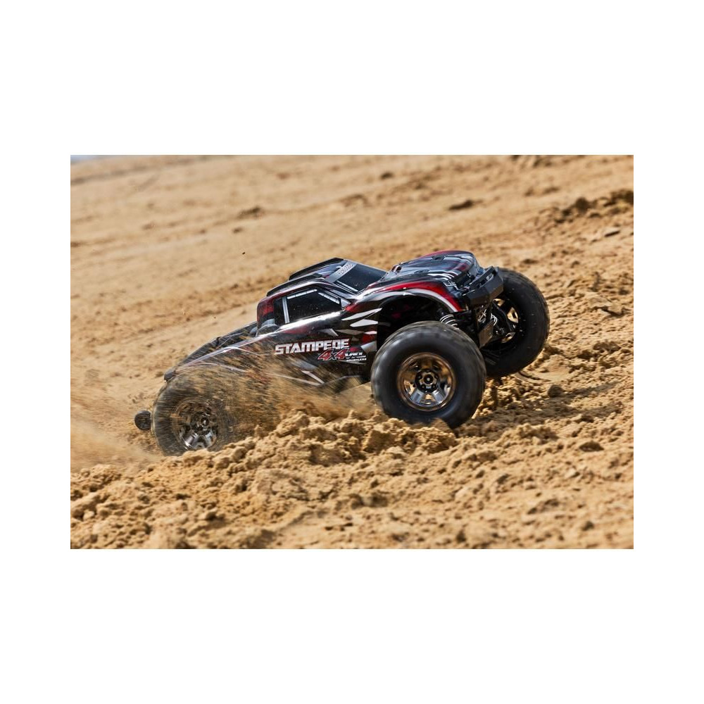 A Stampede 4x4 VXL RC modellautó visszatért - nagyobb és erősebb, mint valaha! A túlméretezett 540XL kefe nélküli motornak és a bevált VXL-3S vezérlőnek köszönhetően a modell játékosan és szórakoztatóan, akár 96 km/h sebességgel is átjut minden akadályon. A 4x4-es hajtás és a TSM elektronikus stabilitási rendszer hozzájárul a kiváló kezelhetőséghez. A nagy tartósság érdekében a Stampede gyárilag az Extreme Heavy Duty készlettel van felszerelve. A letisztult megjelenés és az egyszerű akkumulátorcsere érdekében gyorskioldású karosszéria rögzítő rendszert használnak. A kemény terepjáró kihívásokhoz SledgeHammer gumiabroncsokat használnak.