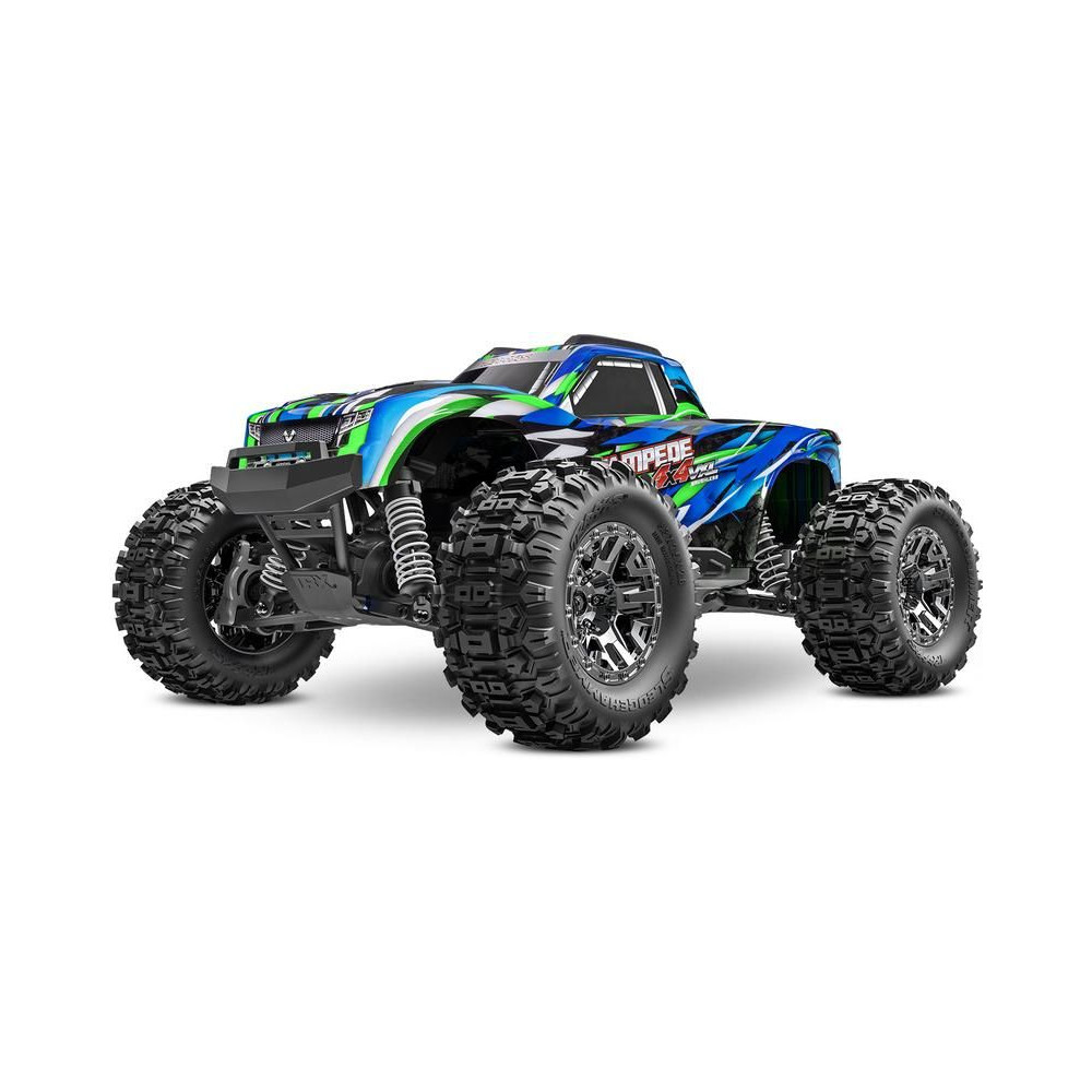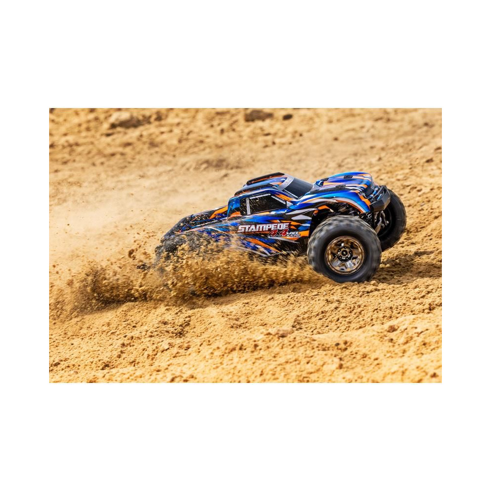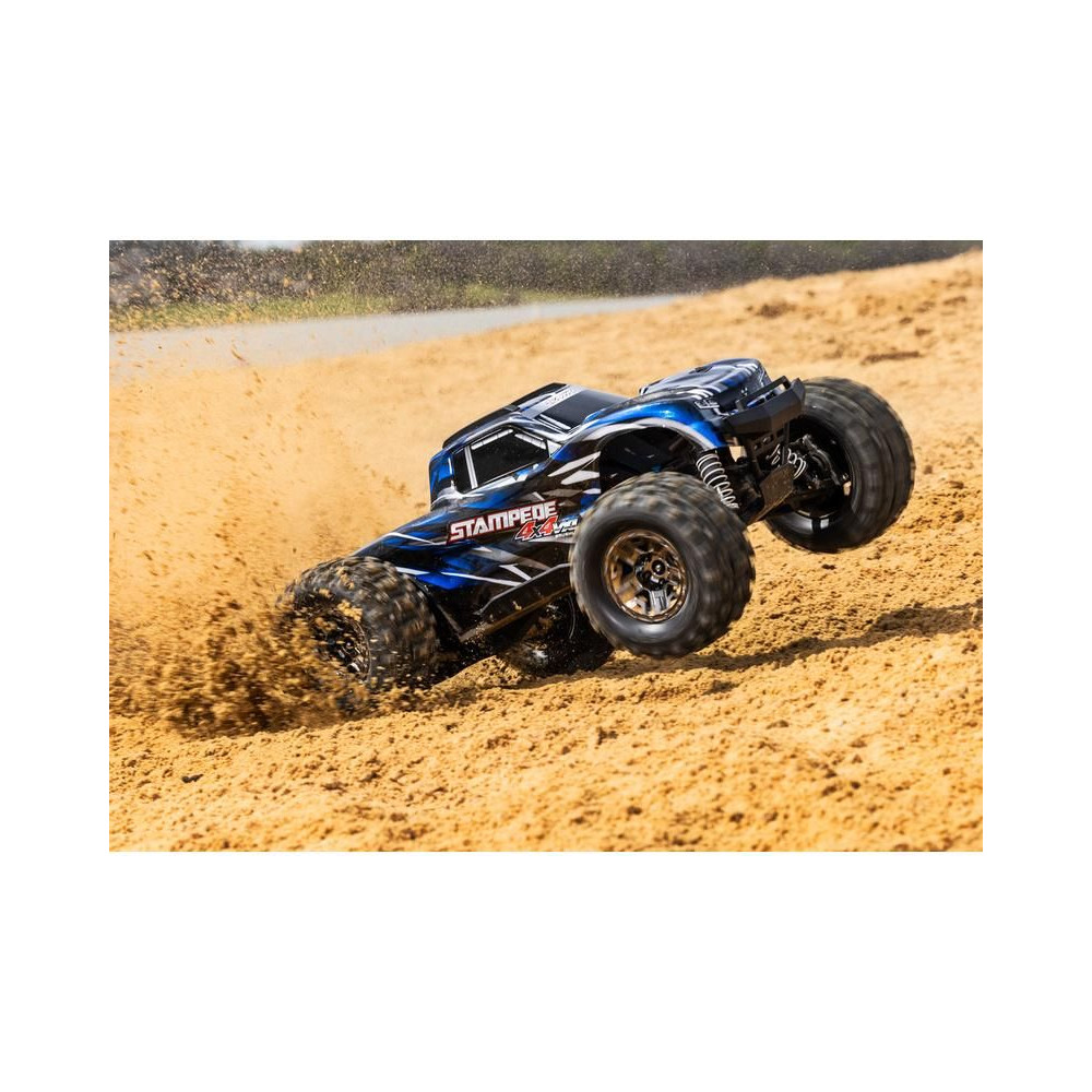 Traxxas Stampede VXL RC modell 1:10 méretarányban, 4x4 hajtással, túlméretezett 540XL kefe nélküli motorral, VXL-3S vezérlővel, akár 96 km/h sebességet is elérhet. Elektronikus menetstabilizátorral. Extreme Heavy Duty alkatrészek a nagy tartósság érdekében, gumírozott karosszériával és Sledgehammer gumiabroncsokkal.
