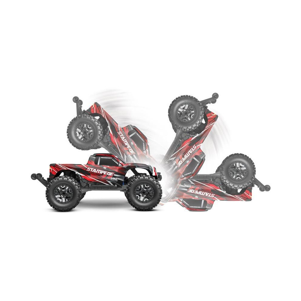 A Stampede 4x4 VXL RC modellautó visszatért - nagyobb és erősebb, mint valaha! A túlméretezett 540XL kefe nélküli motornak és a bevált VXL-3S vezérlőnek köszönhetően a modell játékosan és szórakoztatóan, akár 96 km/h sebességgel is átjut minden akadályon. A 4x4-es hajtás és a TSM elektronikus stabilitási rendszer hozzájárul a kiváló kezelhetőséghez. A nagy tartósság érdekében a Stampede gyárilag az Extreme Heavy Duty készlettel van felszerelve. A letisztult megjelenés és az egyszerű akkumulátorcsere érdekében gyorskioldású karosszéria rögzítő rendszert használnak. A kemény terepjáró kihívásokhoz SledgeHammer gumiabroncsokat használnak.