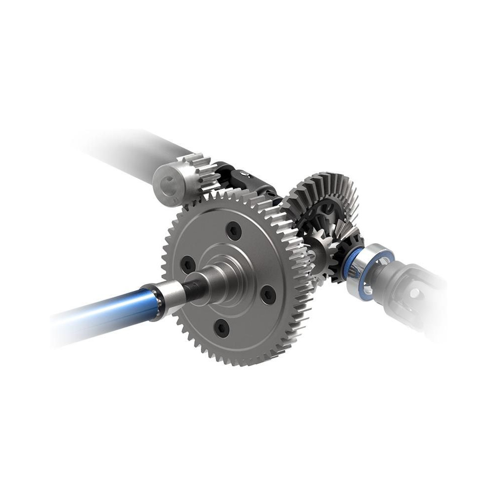Az extrém teljesítmény, maximálisan tartós alkatrészeket igényel. Ezért a hajtáslánc egy acél első kerékből, valamint az első és hátsó tengely közötti erőelosztást biztosító középső differenciálműből áll. Ezenkívül a nyomatékot egy extrudált alumínium középtengelyen keresztül továbbítják az első és hátsó differenciálművekhez, majd robusztus teleszkópos tengelyeken keresztül a kerekekhez. Minden forgó alkatrész kiváló minőségű tokozott csapágyakban van elhelyezve. DifferenciálműAz iálok fém fogaskerekekkel vannak felszerelve a legnagyobb tartósság érdekében.
