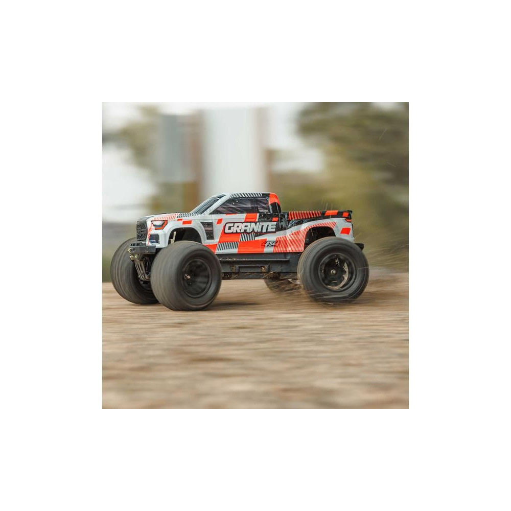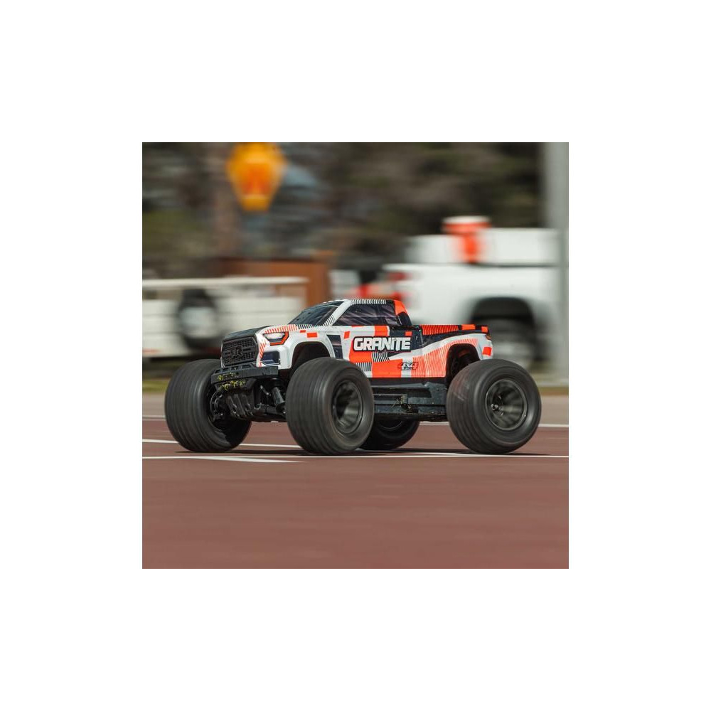 RC autómodell Arrma Granite Mega 1:10 méretarányban, 4x4 meghajtással. Akár 32 km/h sebességet is elérhet. Tartós alváz csúszó lemezekkel és megemelt oldalfalakkal. Robusztus differenciálművek fém fogaskerekekkel. Túlméretezett, 11%-kal nagyobb egyenáramú motor, 665. Olajcsillapítók. Spektrum SLT2 távirányítós készlet.