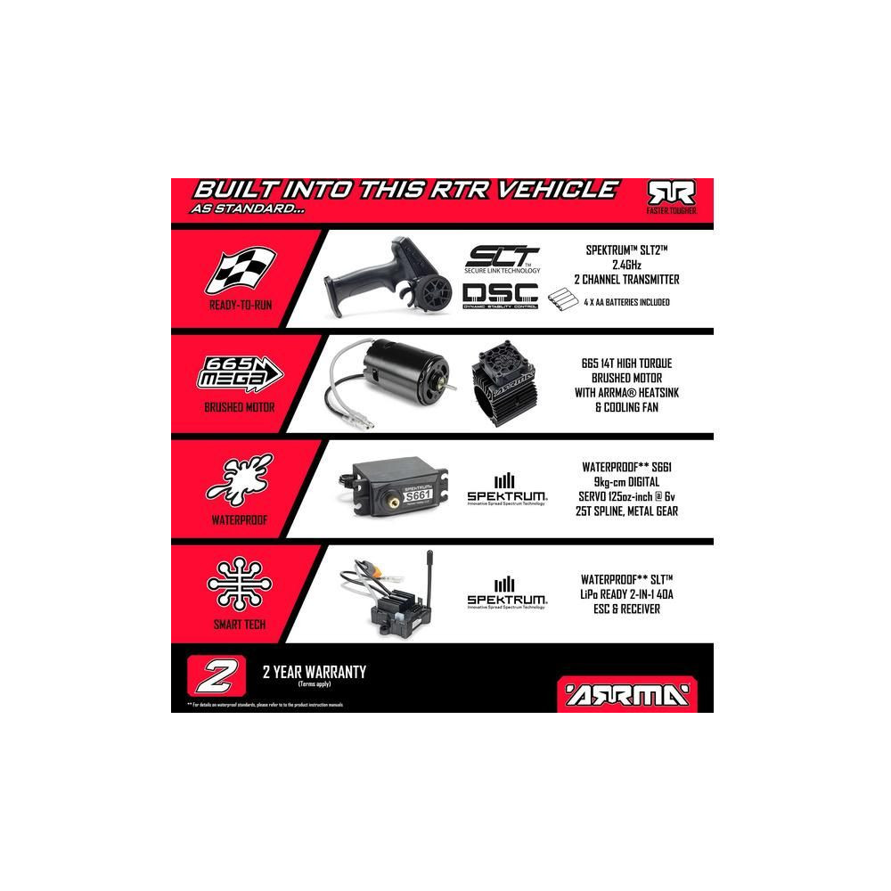 A karosszéria befejezett és festett, és egy rögzítőrendszerrel van felszerelve az alvázhoz, hogy az akkumulátor könnyen cserélhető és hozzáférhessen az elektronikához. A modell egy minőségi Spektrum 2in1 vezérlőegységgel van felszerelve, amely integrált szabályozóval és vevővel rendelkezik. Az akkumulátor típusa könnyen beállítható a készüléken egy rövidzárlatos jumper segítségével. A készülék rendelkezik egy külső vevőegység csatlakoztatására szolgáló porttal is. A nagy 665-ös motor most egy alumínium hűtőt és egy 35 mm-es ventilátort tartalmaz, hogy minden körülmények között megfelelő üzemi hőmérsékletet tartson fenn. Csak add hozzá az akkumulátort és a töltőt (külön kaphatók), és máris indulhatsz az ARRMA GRANITE MEGA 665 4x4-gyel a kertben, a terepen vagy az alacsony fűben, és élvezheted a motorozást.