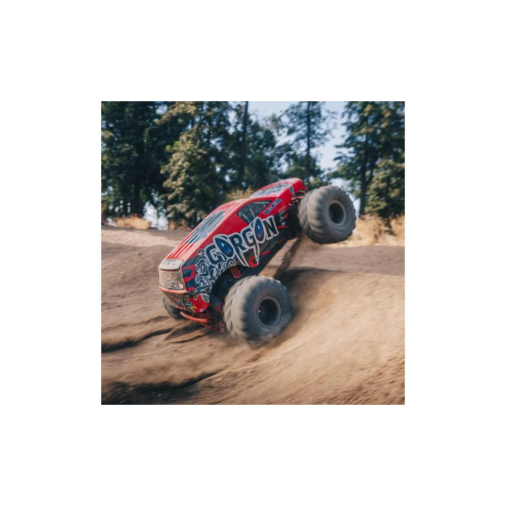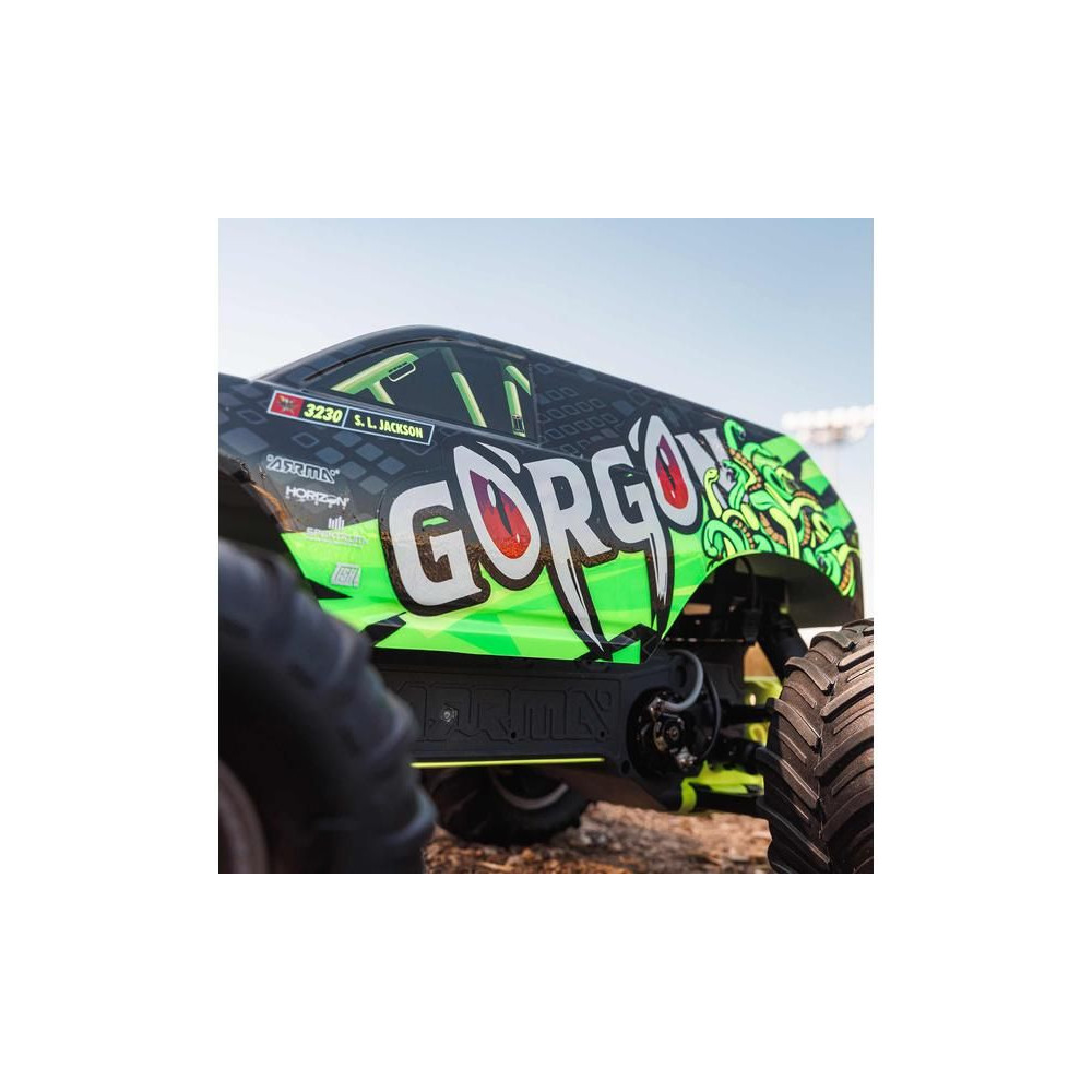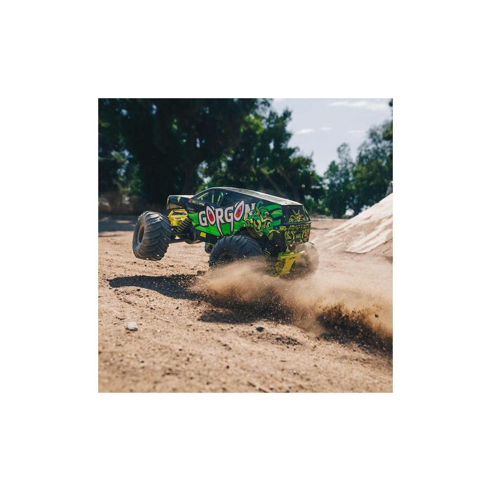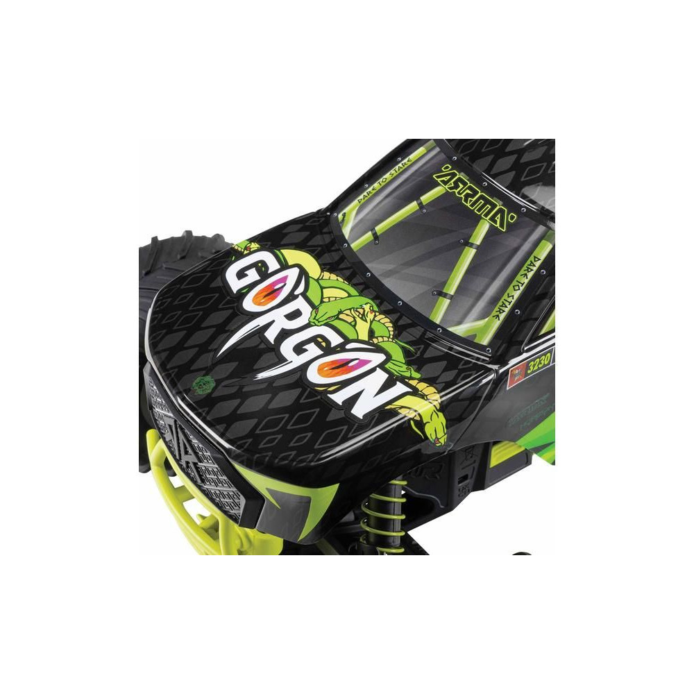 A Gorgon már a dobozból kivéve is magára vonja a figyelmet eredeti megjelenésével. A karosszéria gyárilag, nagyon vonzó modern stílusban készült, és színben harmonizál az egyes alvázalkatrészekkel, például a rugókkal, az akkumulátorrekesszel, a haspáncélokkal és a lökhárítókkal. A bevált ARRMA technológia a kompozit alváznak köszönhetően nagy ellenállást biztosít. A független felfüggesztés, az olajlengéscsillapítók és az állítható hasmagasság kényelmes utazást biztosít. A megállíthatatlan tapadás érdekében a 2WD váltó a MEGA 550 DC motor erejét a hatalmas, 130 mm-es dBoots ® Chevron gumiabroncsokhoz továbbítja, amelyek 57 mm-es nejlon tárcsákra vannak szerelve. A használt fém fogaskerekek elég tartósak ahhoz is, hogy esetleg váltakozó áramú meghajtásra váltsanak.