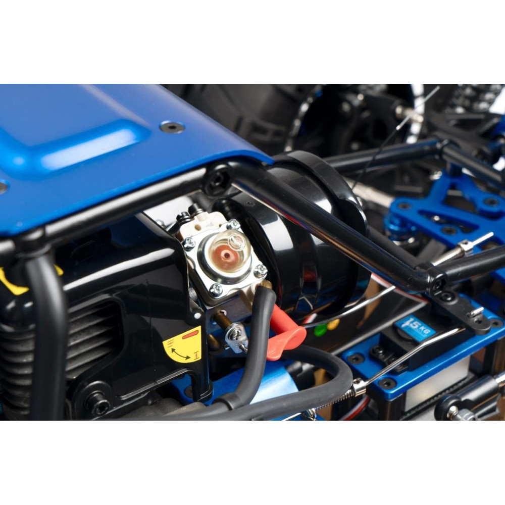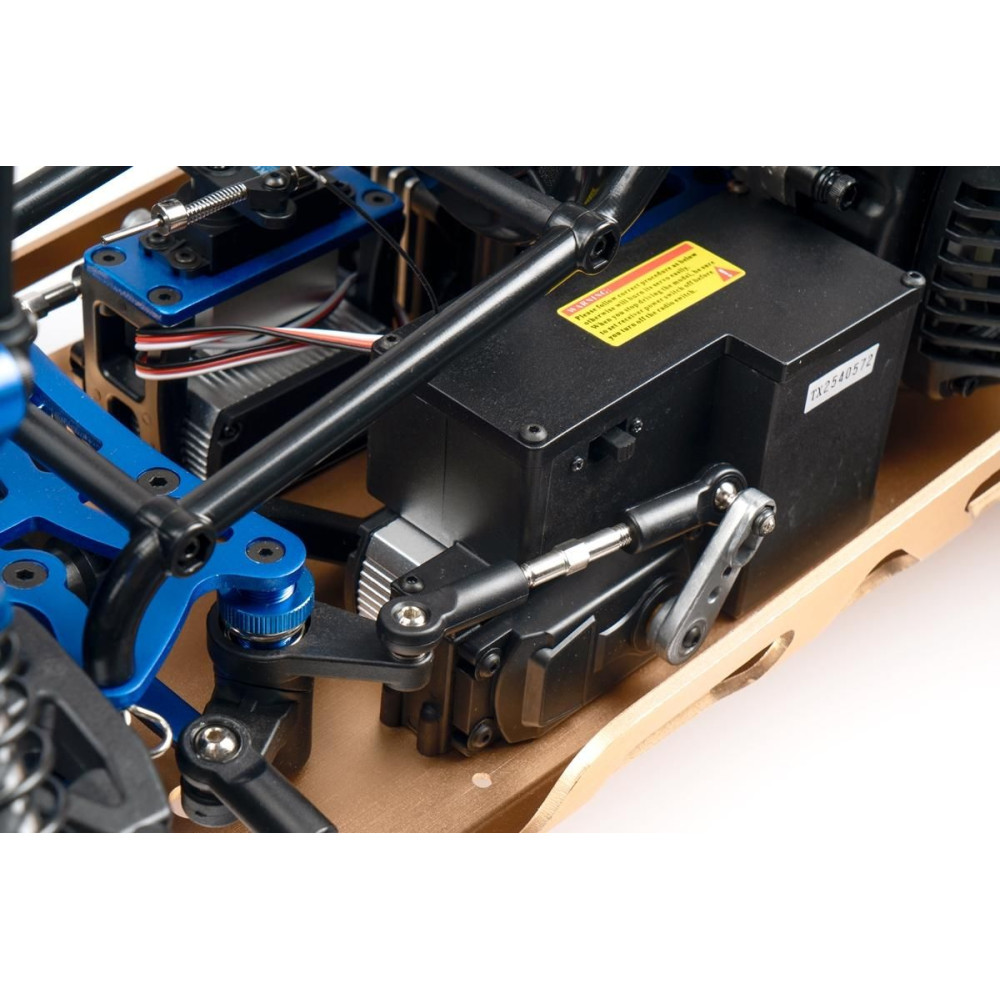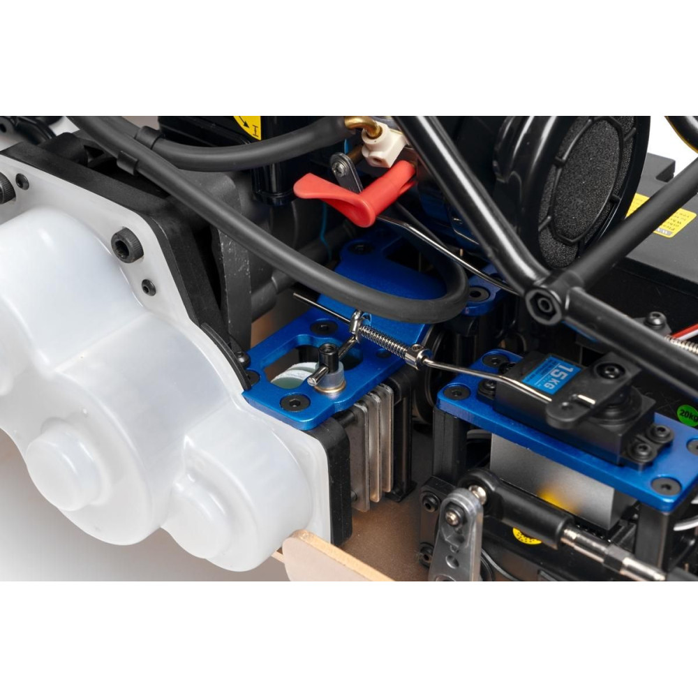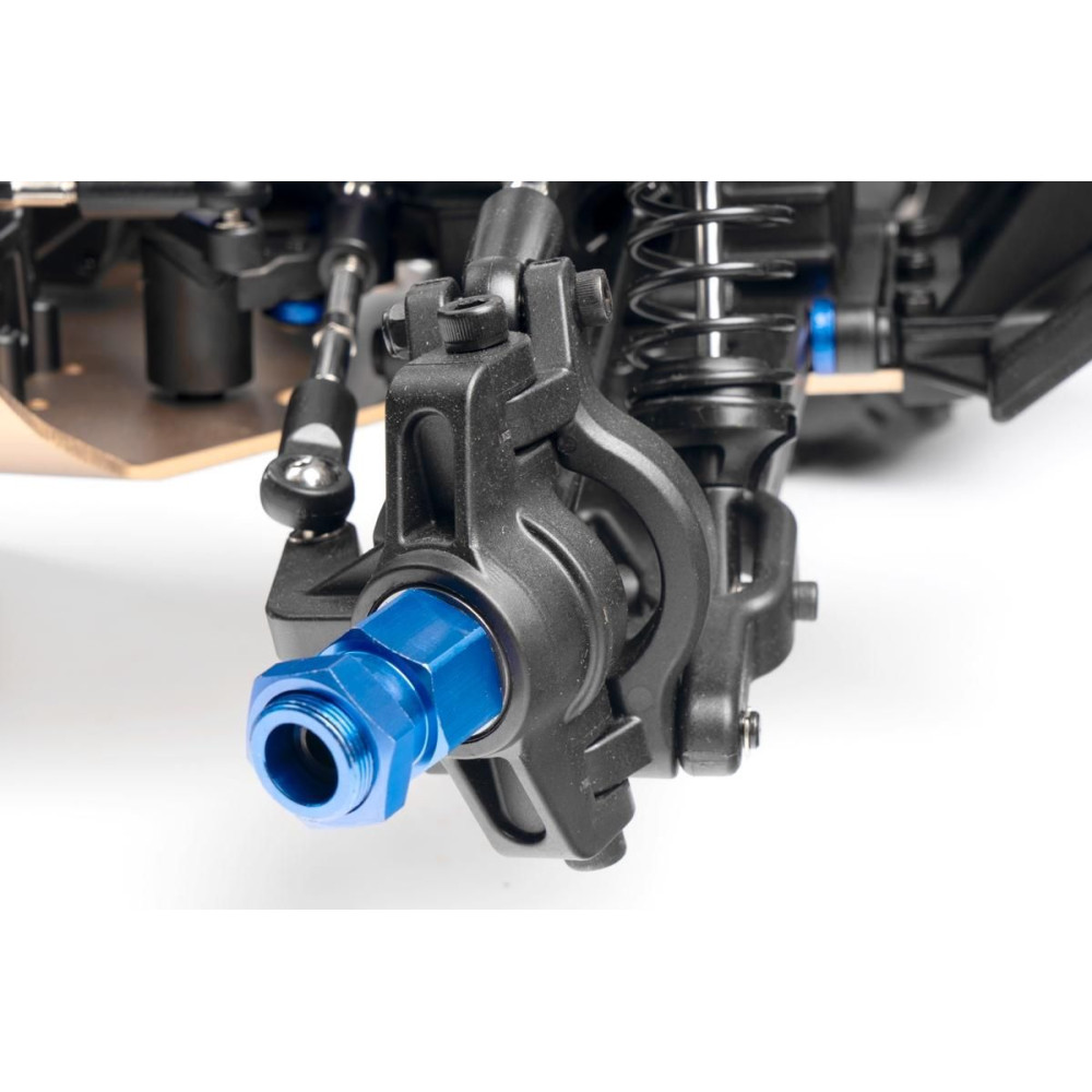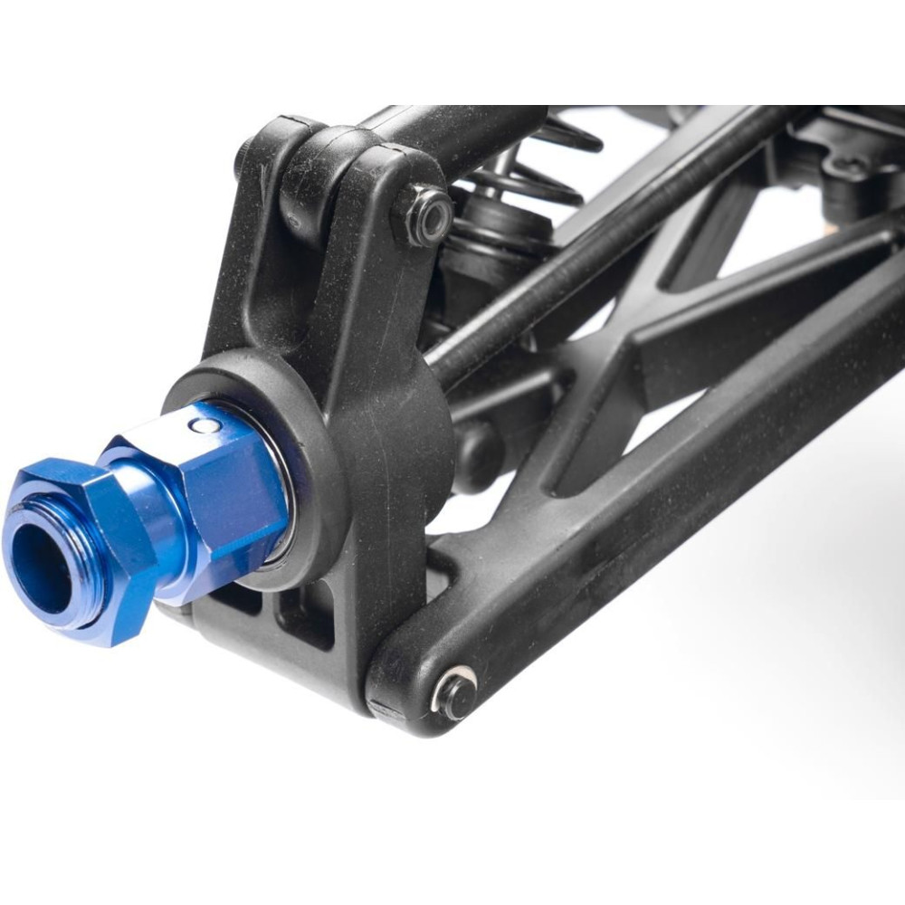 Minden összekötő rúd (lengőkar csavarok stb.) 7 mm átmérőjű acélból készült, jobb-bal menettel és hatszögletű csavarral ellátva, ami lehetővé teszi az alváz geometriájának kényelmes és precíz beállítását. Négy, teljesen fémből készült, tekercsrugós olajlengéscsillapító gondoskodik a felfüggesztésről. A rugó előfeszítése könnyen állítható egy finom menetű anyával. A kék eloxált lengéscsillapító tartók (agancsok) 8 mm vastag dúralumíniumból készültek. A keréktárcsák csavaros gyűrűvel vannak ellátva, amely rögzíti az abroncsot ragasztás nélkül. Az alacsony profilú gumiabroncsok bevált "buggy" mintázattal rendelkeznek, és 178 mm átmérőjűek. Ennél a modellnél a biztonságos megállításhoz erő kell, ezért dupla tárcsafék kerül beépítésre.