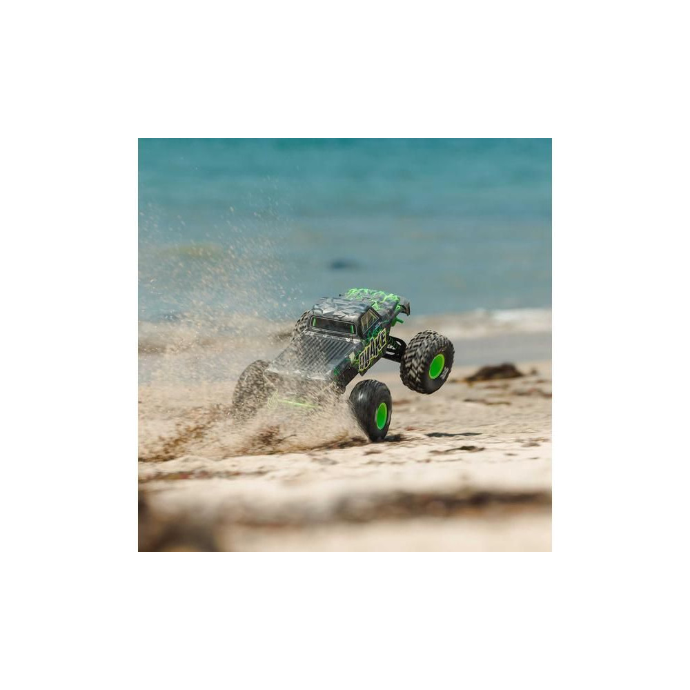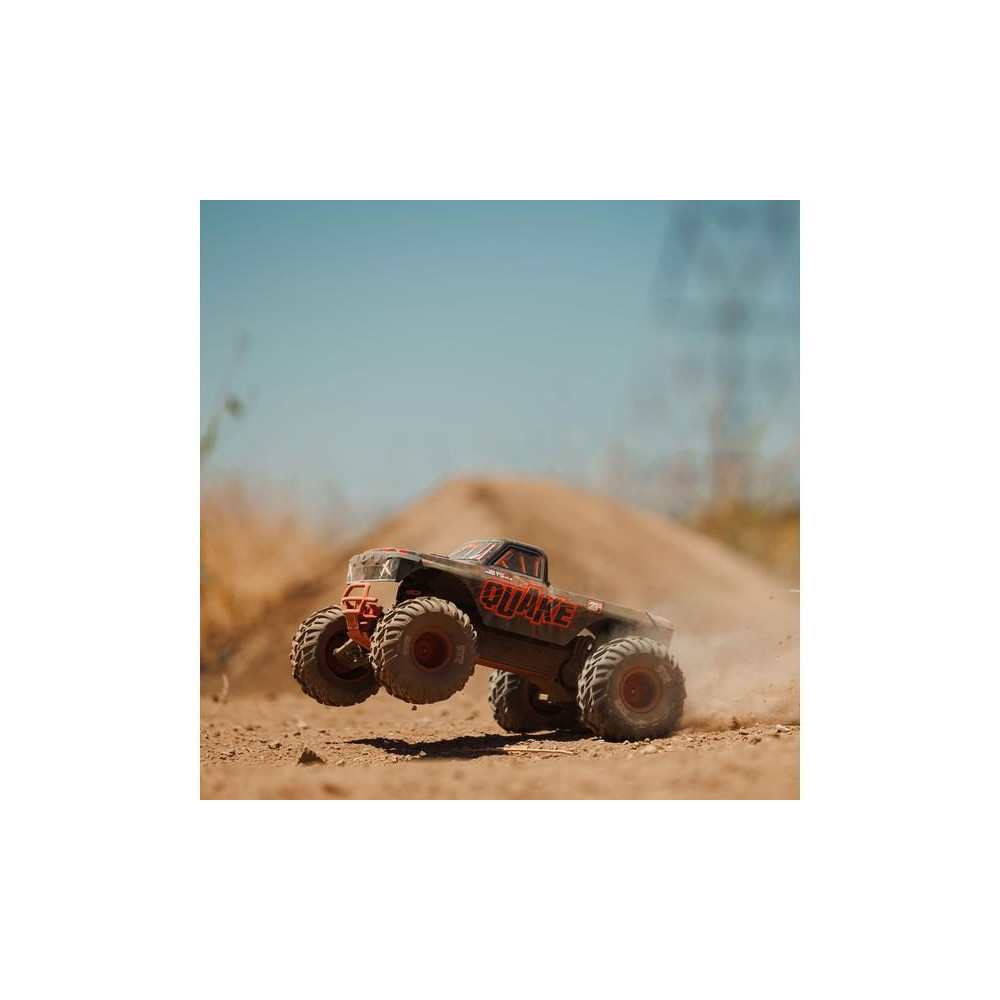 Az Arrma Quake a népszerű monster truck modellek klasszikus konstrukciójával rendelkezik, magas hasmagassággal és nagy kerekekkel, ami lehetővé teszi, hogy szinte bármilyen környezetben versenyezzen - terepen, füvön, parkolóban és aszfaltfelületen. Különösen nehéz terepen és nagy egyenetlenségeken való vezetéskor lesz verhetetlen. A kompozit alváz még az erős ütéseket is ellenállja. A használt fém fogaskerekek kellően tartósak a váltakozó áramú meghajtáshoz. A maximális tapadást a bevált dBoots Cut Chevron MT gumiabroncsok biztosítják, tipikus nyílmintázattal. A Spektrum SLT adó biztonságos működést biztosít meghibásodások nélkül, a gondtalan vezetés érdekében a modell vízálló* alkatrészeket használ - Spektrum 2 az 1-ben 45A vevőszabályozót és Spektrum S681 szervo vezérlést nagy nyomatékkal.