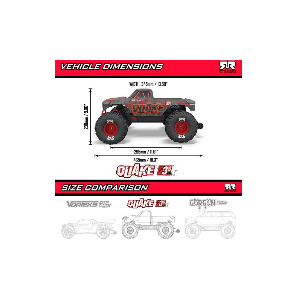 Az Arrma Quake 223S BLX monster truck távirányítású modellje erős AC motorral és akár 80 km/h sebességgel. 2WD meghajtás, független felfüggesztés, olajos lengéscsillapítók, Spektrum 45A SLT vezérlőegység, 2-3S LiPo tápegység, DSC elektronikus stabilizálás.