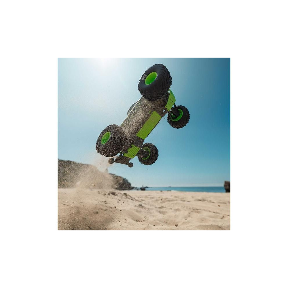 Az Arrma Quake a népszerű monster truck modellek klasszikus konstrukciójával rendelkezik, magas hasmagassággal és nagy kerekekkel, ami lehetővé teszi, hogy szinte bármilyen környezetben versenyezzen - terepen, füvön, parkolóban és aszfaltfelületen. Különösen nehéz terepen és nagy egyenetlenségeken való vezetéskor lesz verhetetlen. A kompozit alváz még az erős ütéseket is ellenállja. A használt fém fogaskerekek kellően tartósak a váltakozó áramú meghajtáshoz. A maximális tapadást a bevált dBoots Cut Chevron MT gumiabroncsok biztosítják, tipikus nyílmintázattal. A Spektrum SLT adó biztonságos működést biztosít meghibásodások nélkül, a gondtalan vezetés érdekében a modell vízálló* alkatrészeket használ - Spektrum 2 az 1-ben 45A vevőszabályozót és Spektrum S681 szervo vezérlést nagy nyomatékkal.