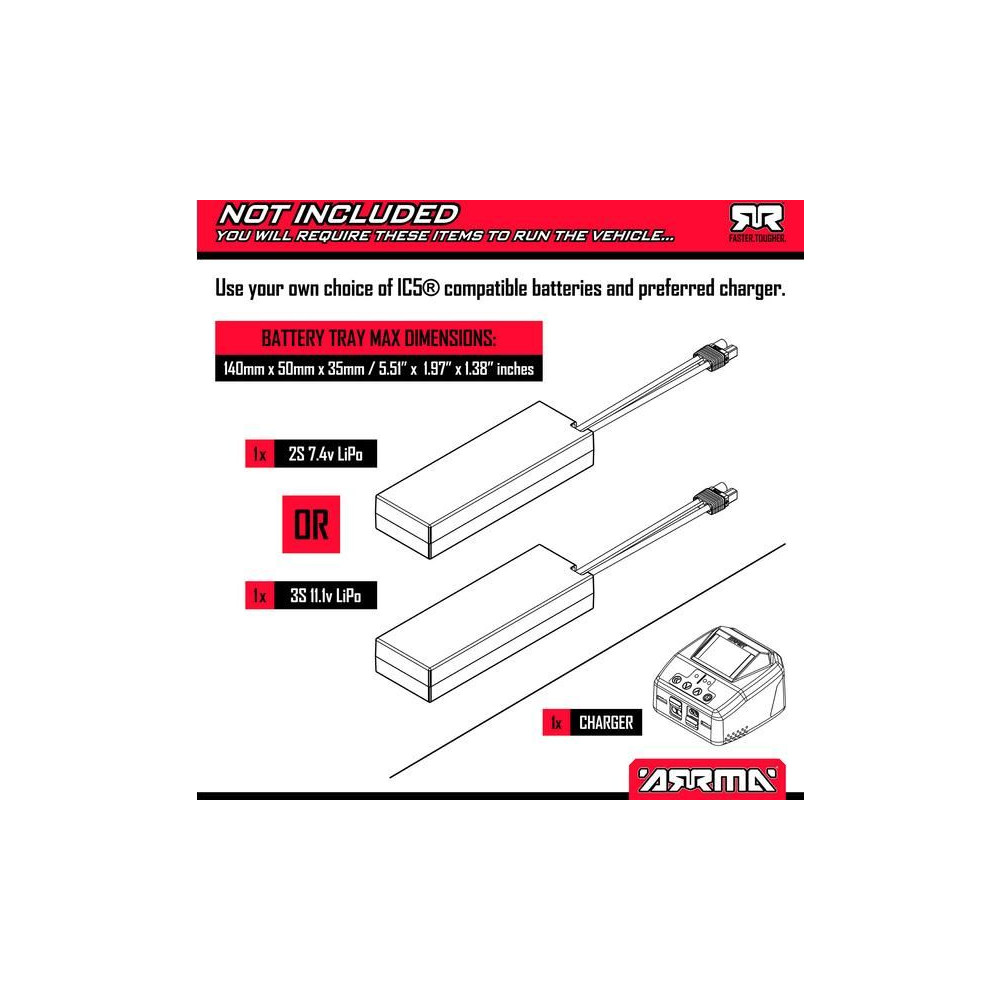 Az Arrma Quake egy sokoldalú, nagy teljesítményű modell, amely fokozatosan fejleszthető a vezetési képességeiddel együtt. Kezdetben 2S LiPo akkumulátorral működtetheted a modellt, és a gázteljesítményt 50%-ra korlátozhatod. Később a gázt 75%-ra és 100%-ra növelheted, sőt, egy 3S LiPo akkumulátort is csatlakoztathatsz a modellhez, és akár 80 km/h sebességet is elérhetsz.