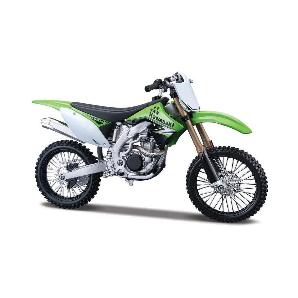 1:12 méretarányú Maisto 39175 modell Kawasaki KX 450F motocross motorkerékpár nem csak gyűjtőknek. Részletes kivitelezés, nagyon barátságos ár, hossza 16 cm. A modell készlet formájában készült.