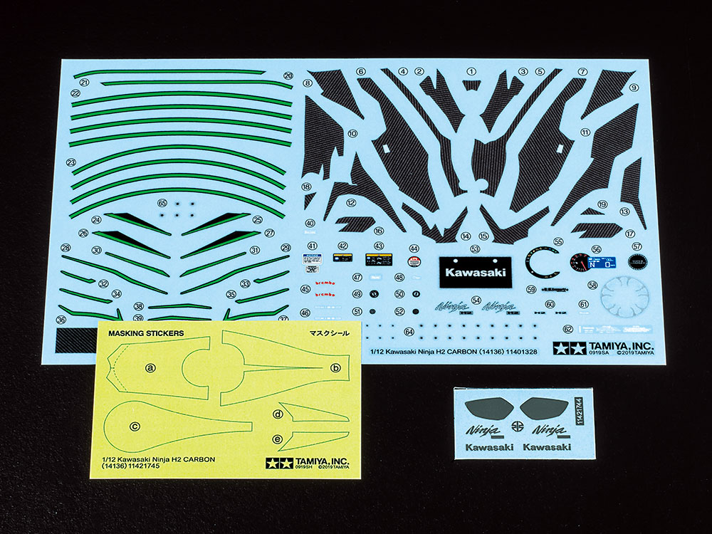 | Skutočne jedinečná a vycibrená aerodynamická forma modelu Ninja H2 Carbon je v mierke 1/12 s aplombom zachytená týmto modelom montážnej súpravy. | Po dokončení je možné skrutkou pripevniť horné a bočné kryty krytu z rámu. Model na tomto obrázku je bez palivovej nádrže. | Nálepky sú súčasťou súpravy na rekreáciu horného krytu z uhlíkových vlákien, na ktorý odkazuje motocykel. |