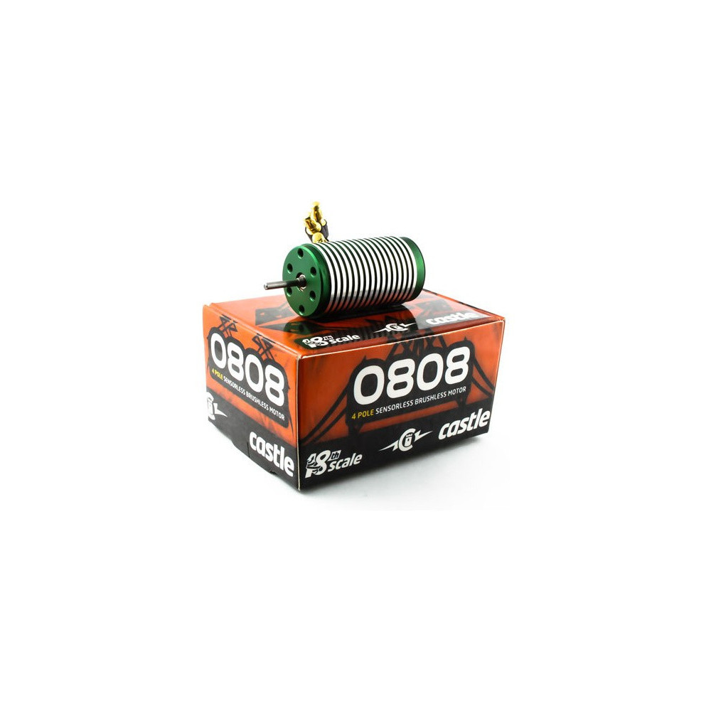 A Castle 0808 4 pólusú kefe nélküli versenymotor 5300 fordulat/perc/V fordulatszámmal az 1:18 méretarányú RC autó motorok között a csúcsot képviseli. Kis méret, de brutális teljesítmény, fejlett kialakítás és kiváló minőségű kivitelezés. Tápellátás akár 2-3 LiPol vagy 4-12 NiMH.
