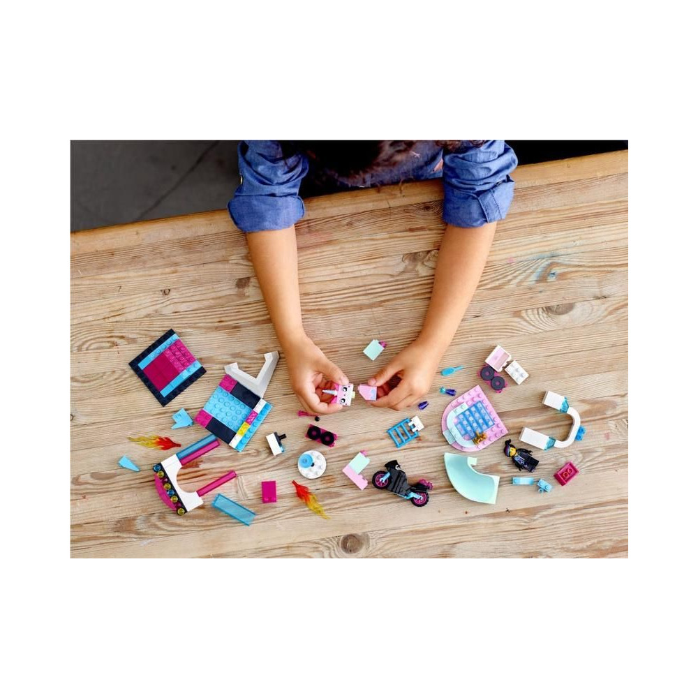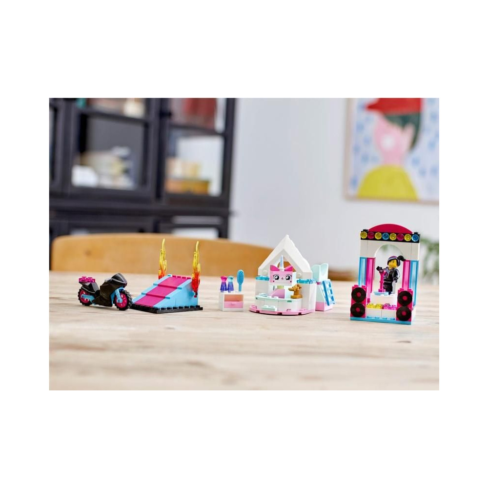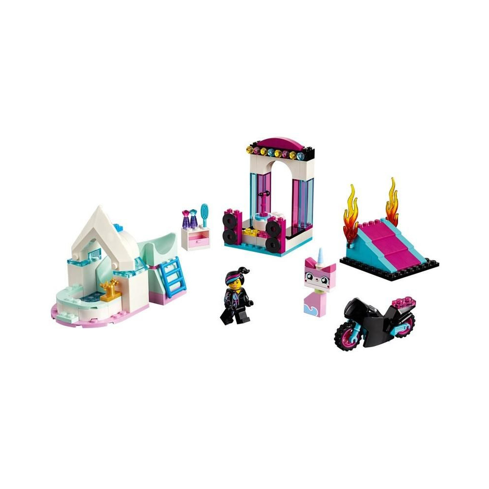 - Ez a 3 az 1-ben készlet 3 megépíthető modellt tartalmaz: Lucy motorkerékpárját játszórámpával, egy táncszínpadot és Unikitty fürdőjét.