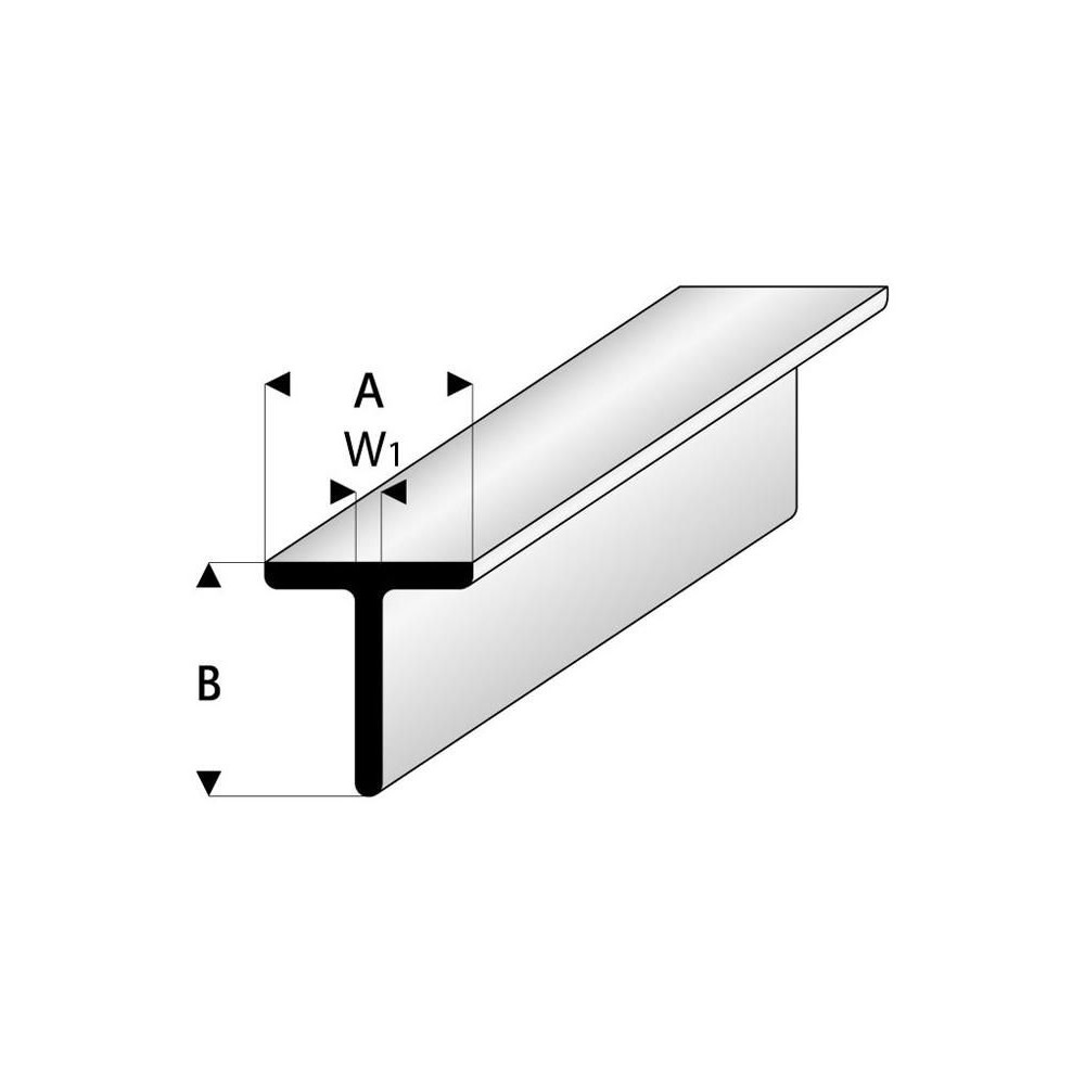 ASA műanyagból készült T-profil, nagy mechanikai szilárdsággal, stabilitással, UV-, víz- és olajállósággal. Az anyag könnyen feldolgozható, festésre alkalmas. Méretek: 4 x 4 x 1000 mm (A x B x L), 0,7 mm (W1), szín: fehér.