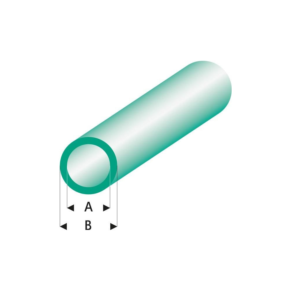 ASA műanyagból készült kerek cső, nagy mechanikai szilárdsággal, stabilitással, UV-, víz- és olajállósággal. Az anyag könnyen feldolgozható, festésre alkalmas. Méretek: 2 x 3 x 330 mm (A x B x L), 5 db, szín: átlátszó zöld.