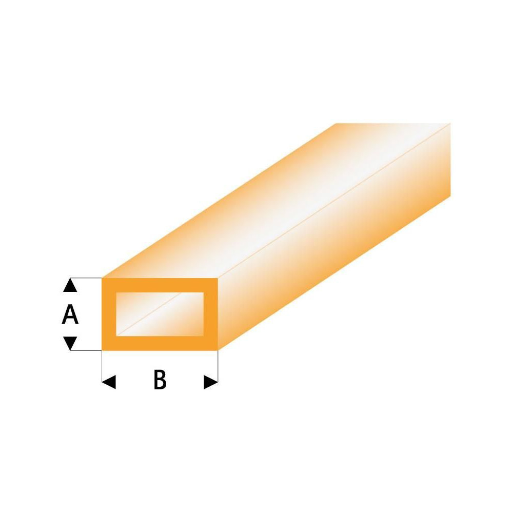 ASA műanyagból készült négyszögletes cső, nagy mechanikai szilárdsággal, stabilitással, UV-, víz- és olajállósággal. Az anyag könnyen feldolgozható, festésre alkalmas. Méretek: 3 x 6 x 330 mm (A x B x L), 5 db, szín: átlátszó narancssárga.