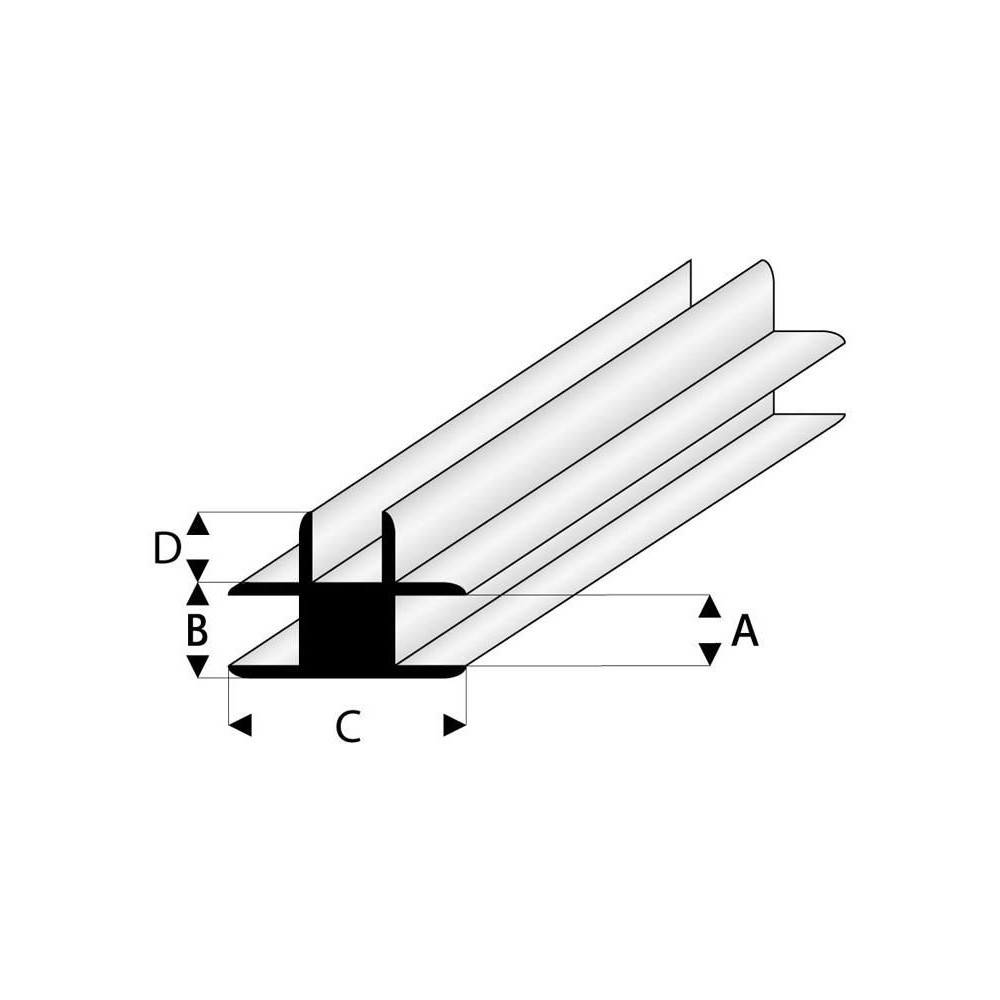 ASA műanyagból készült T-csatlakozó profil, nagy mechanikai szilárdsággal, stabilitással, UV-, víz- és olajállósággal. Az anyag könnyen feldolgozható, festésre alkalmas. Méretek: 4 x 1000 mm (A x hossz), 6 x 4 mm (B x C), szín: fehér.