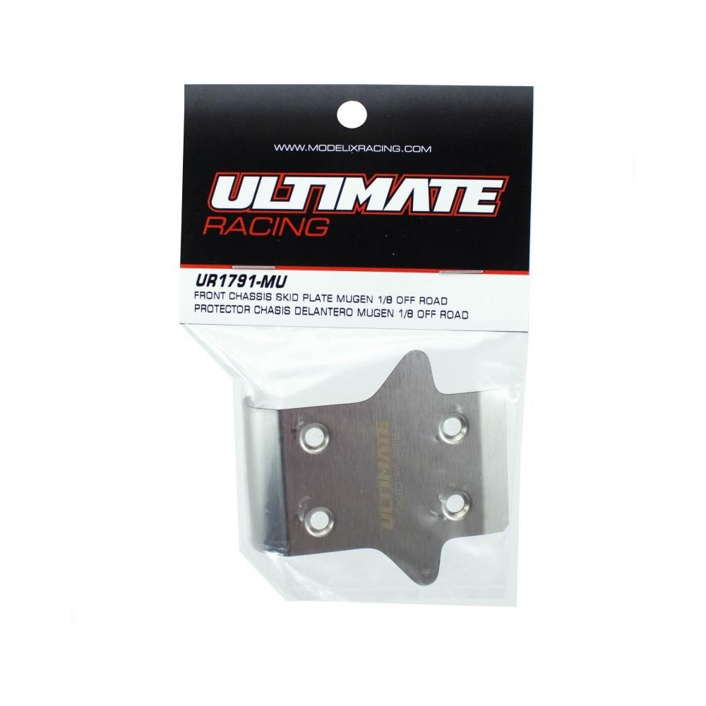 Ultimate Racing első alvázvédő lemez a Mugen 1/8 Off Roadhoz. Az MBX8 és MBX8R platformokhoz tervezett csúszótalpas lemez fokozott alvázvédelmet nyújt a kopással szemben. 0,5 mm-es rozsdamentes acélból készül, és az egyik legegyszerűbb módja járműve védelmének. A csomag egy ezüstszínű Ultimate csúszásgátló lemezt tartalmaz lézergravírozással.