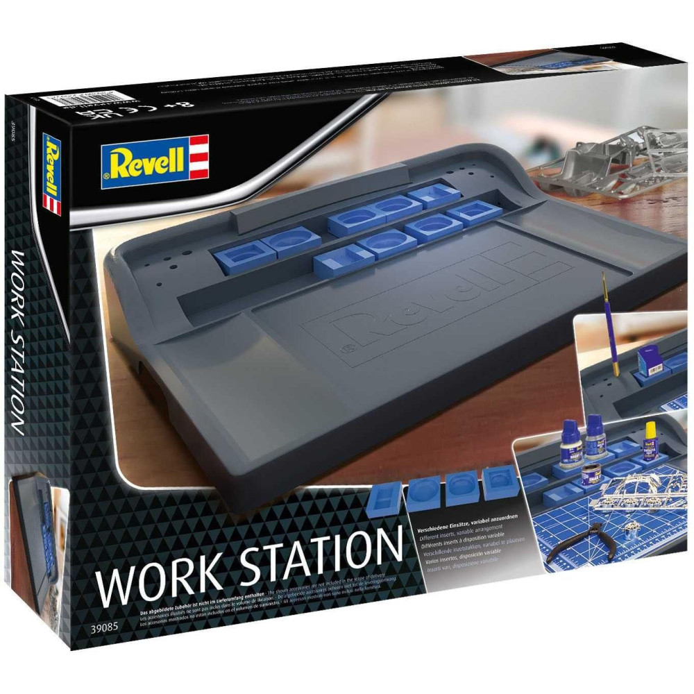 Ez a munkaállomás ideális helyet teremt bármilyen modellezési munkához. Praktikus tárolóhelyekkel és variálható állványokkal van felszerelve a szerszámok, ecsetek és kiegészítők számára, valamint helyet biztosít a Revell vágószőnyeg elhelyezésére.