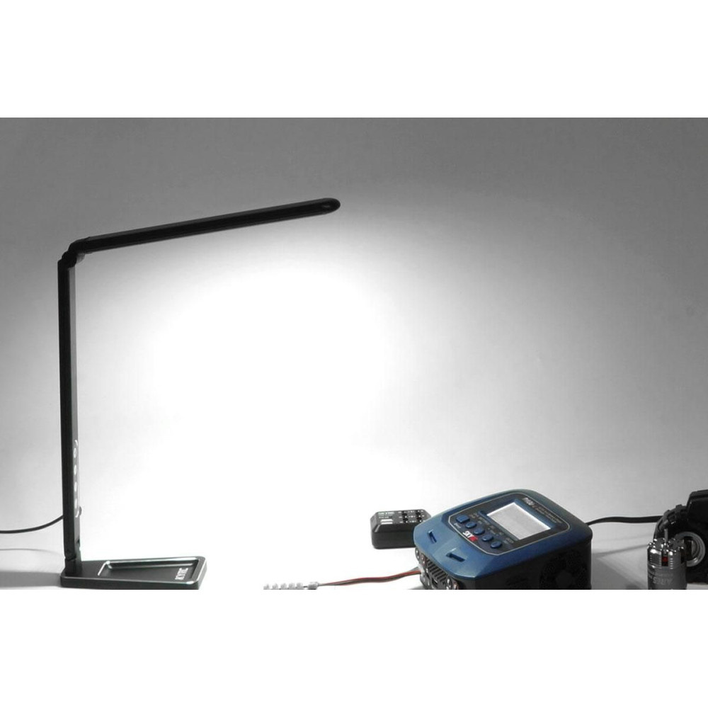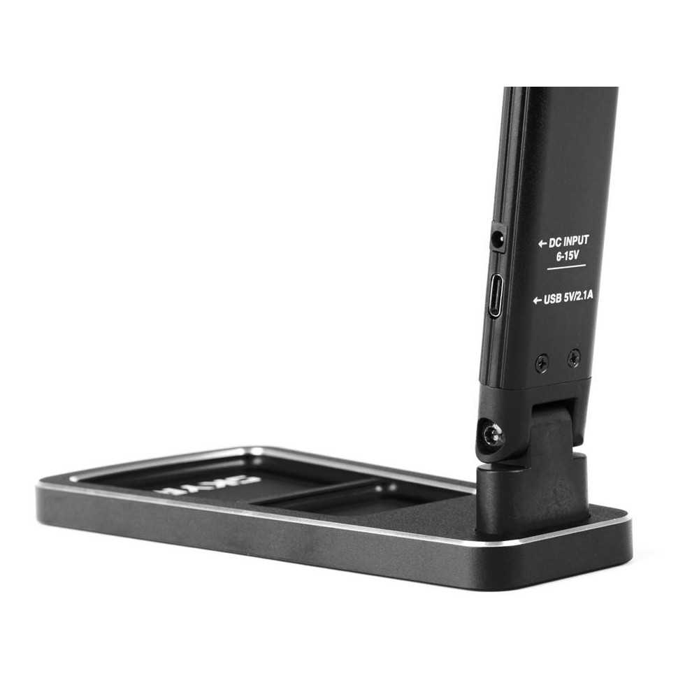 Összecsukható LED lámpa 100 W-os izzóval, raktári munkához, csavarok tárolására alkalmas hellyel. Három színhőmérséklet és hat fényerősségi szint kapcsolható gombokkal. Tápegység 6-15V (teljesítményfelvétel max. 11W) vagy USB-C 5 V/2.1A. Tápkábel 4 mm-es banándugóval és USB-C csatlakozóval. Textil tokban.
