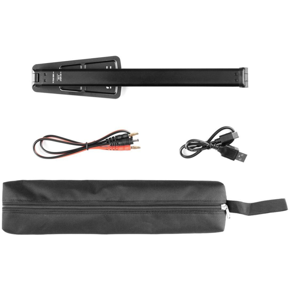 A lámpakészlet tartalma: Összecsukható LED lámpa, tápkábel 4 mm-es banándugóval, USB-C tápkábel, vászontok a lámpához, használati utasítás.