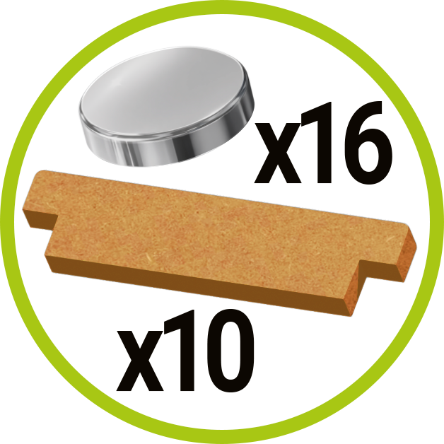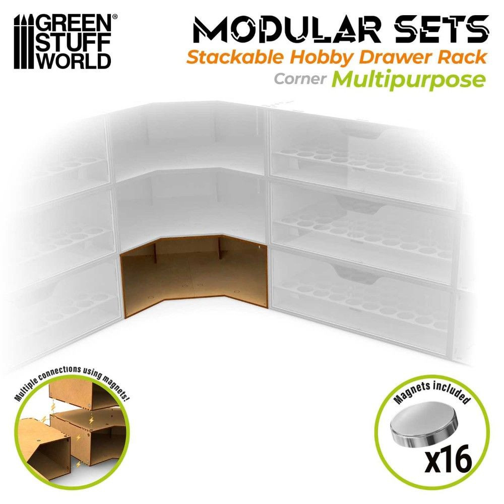 Tartsa rendben munkapadját ezzel az egymásra rakható, mágneses sarokmodullal, amely természetes MDF fából készült. Alkatrészei nagy pontosságú lézervágással vannak ellátva a tiszta élek és a tökéletes illeszkedés érdekében. Úgy tervezték, hogy tökéletesen illeszkedjen a család többi moduláris kiegészítőjéhez, lehetővé téve, hogy rugalmas és bővíthető rendszert hozzon létre festékek, szerszámok és modellező vagy kézműves kellékek számára, kihasználva a sarkokat és átszervezve munkaterületét, amikor csak szüksége van rá.
