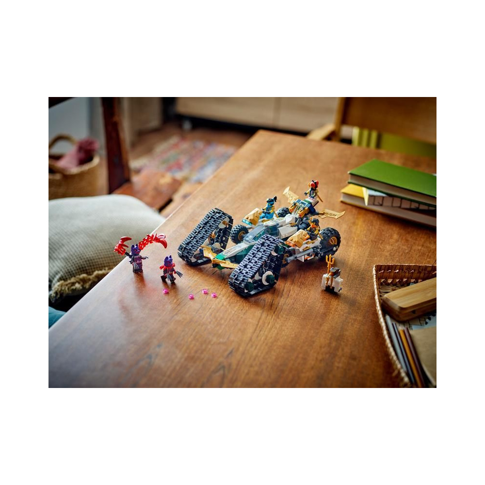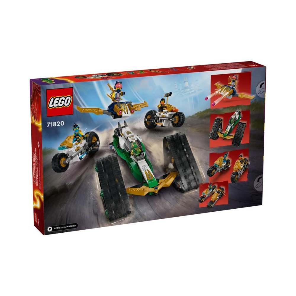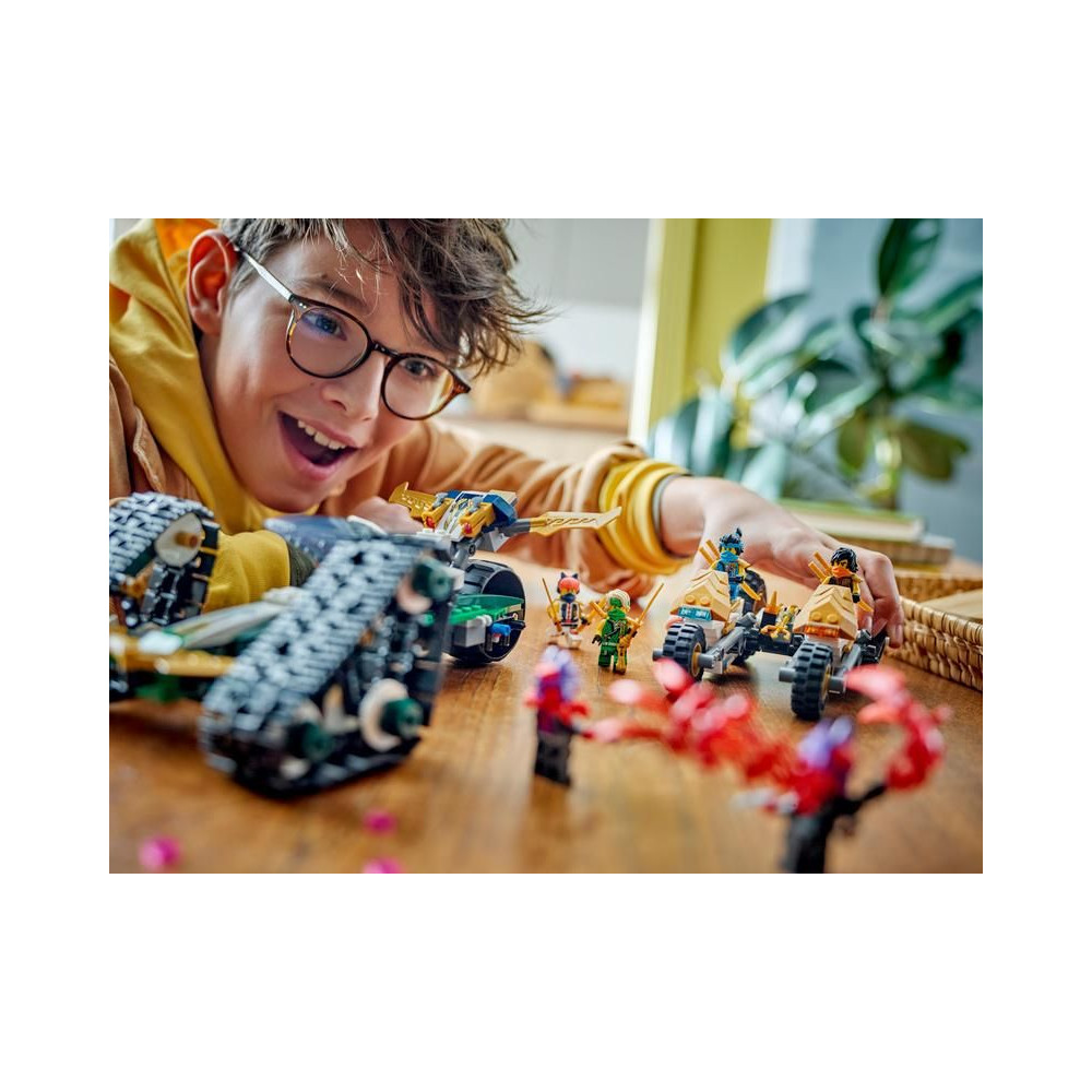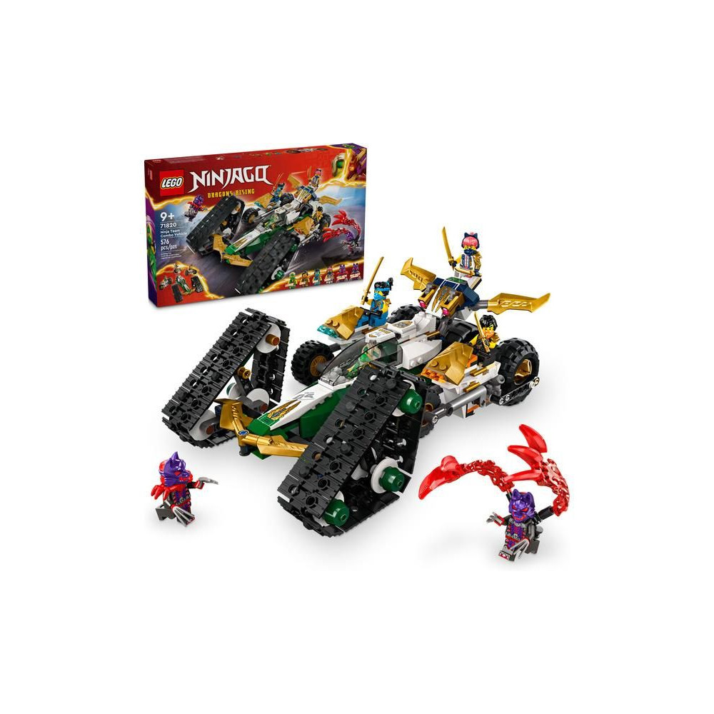A 9 éves és idősebb fiúk és lányok a NINJAGO® Dragon Rising TV-sorozat 2. évadának akciódús kalandjait élvezhetik a Team Ninja és Combo Vehicle (71820) 4 az 1-ben készlettel. A gyerekek nagy adag szórakozást találnak a nagy NINJAGO akciómodellel, amelyet aztán 4 kisebb járműre oszthatnak: a Sora siklórepülőgépre 2 katapultálóval, Lloyd terepjárójára, valamint Cole és Nya motorjaira.
