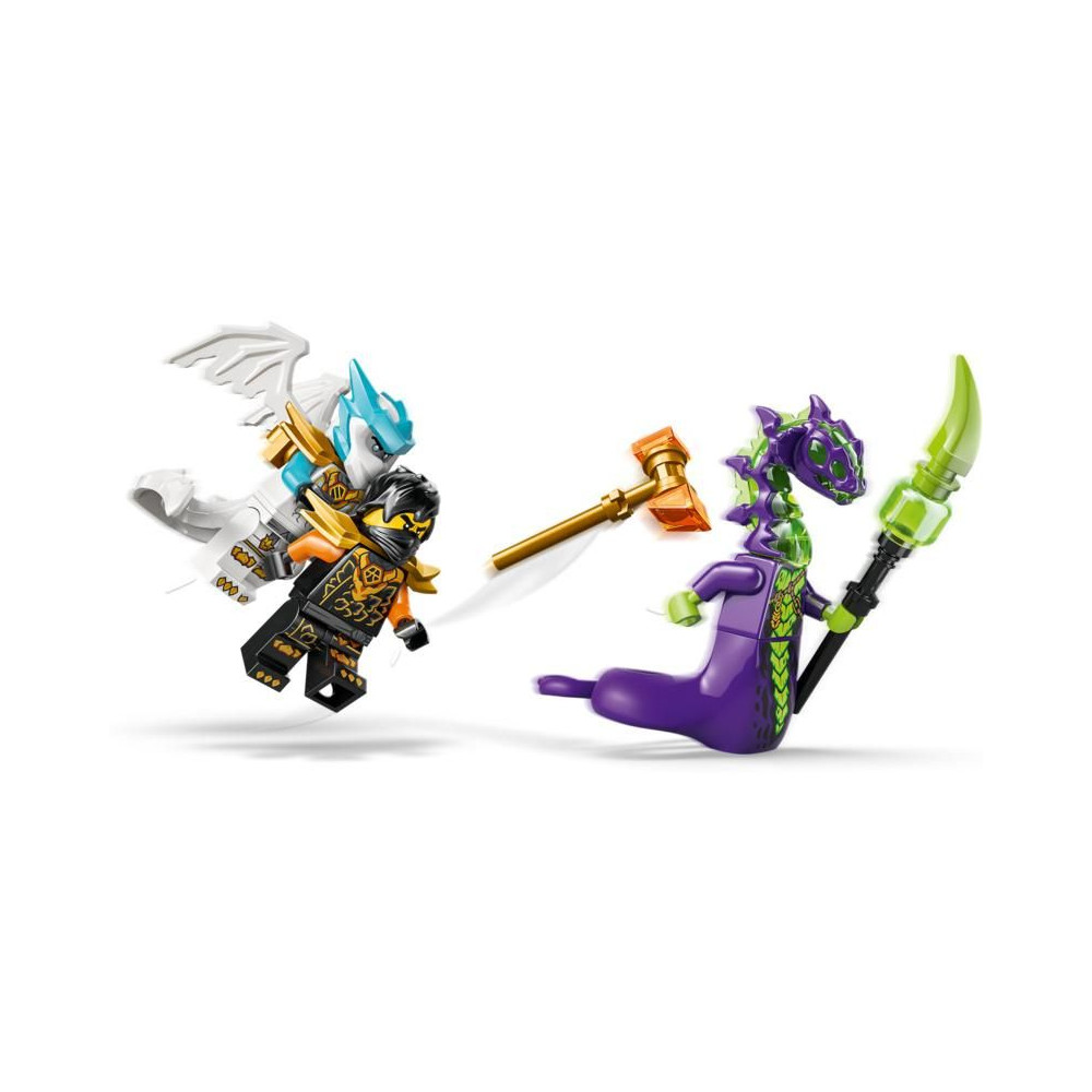 Ez a NINJAGO játék 3 minifigurát is tartalmaz: Cole-t egy kalapáccsal, Zane-t sárkány formájában egy karddal és egy savszörnyeteget egy bottal a csatákhoz.