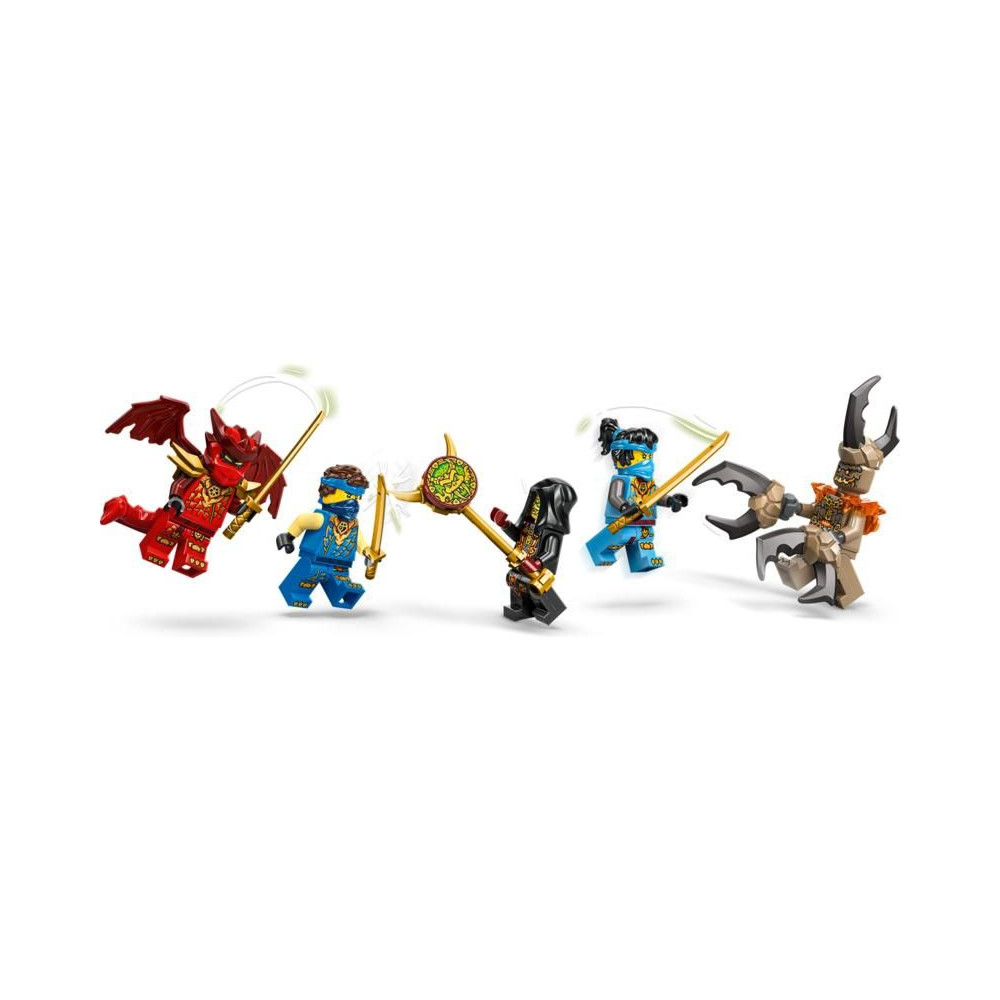 A készlet 5 LEGO NINJAGO minifigurát is tartalmaz: Jayt, Nyát és Kait sárkány formájában, valamint gonosztevőket egy gonosz földi szörnyeteg és a hűségesek vezetőjének képében, akik a jó és a rossz csatáit vívják.