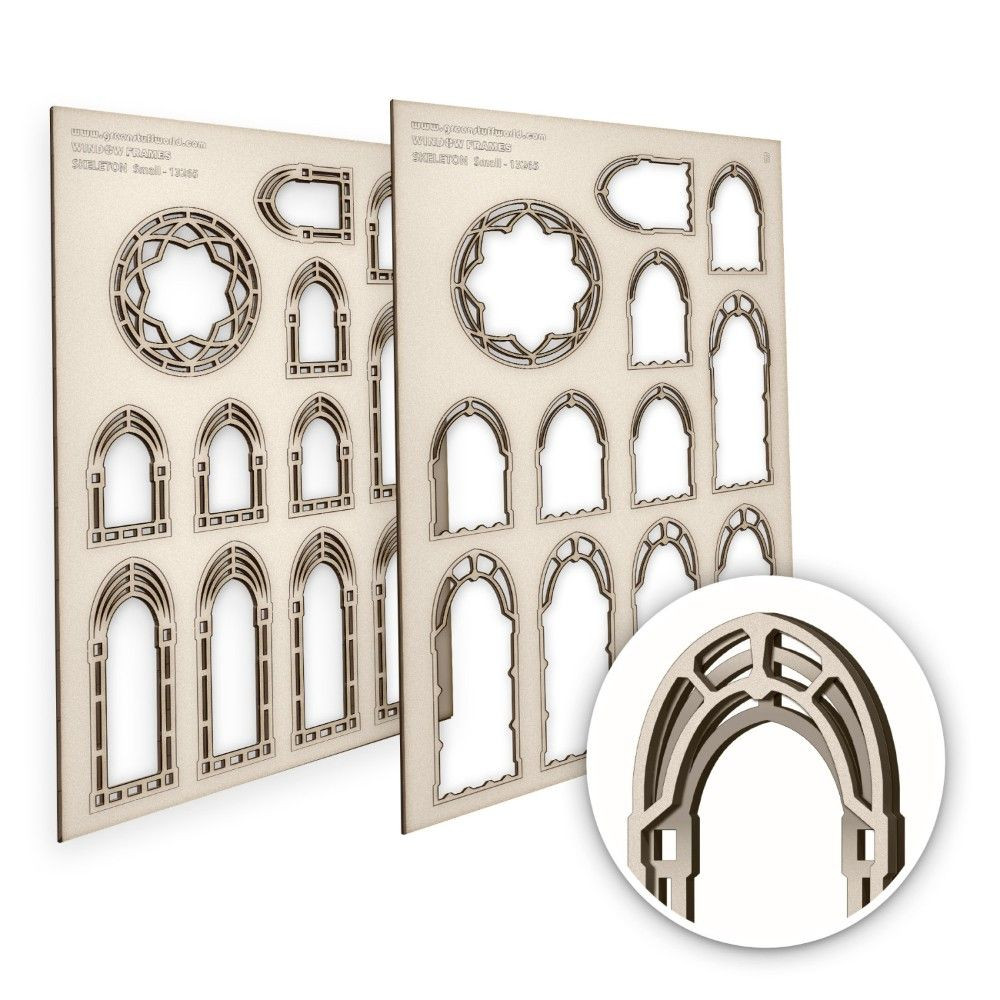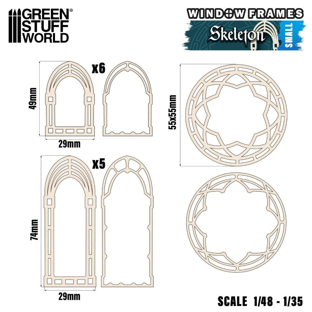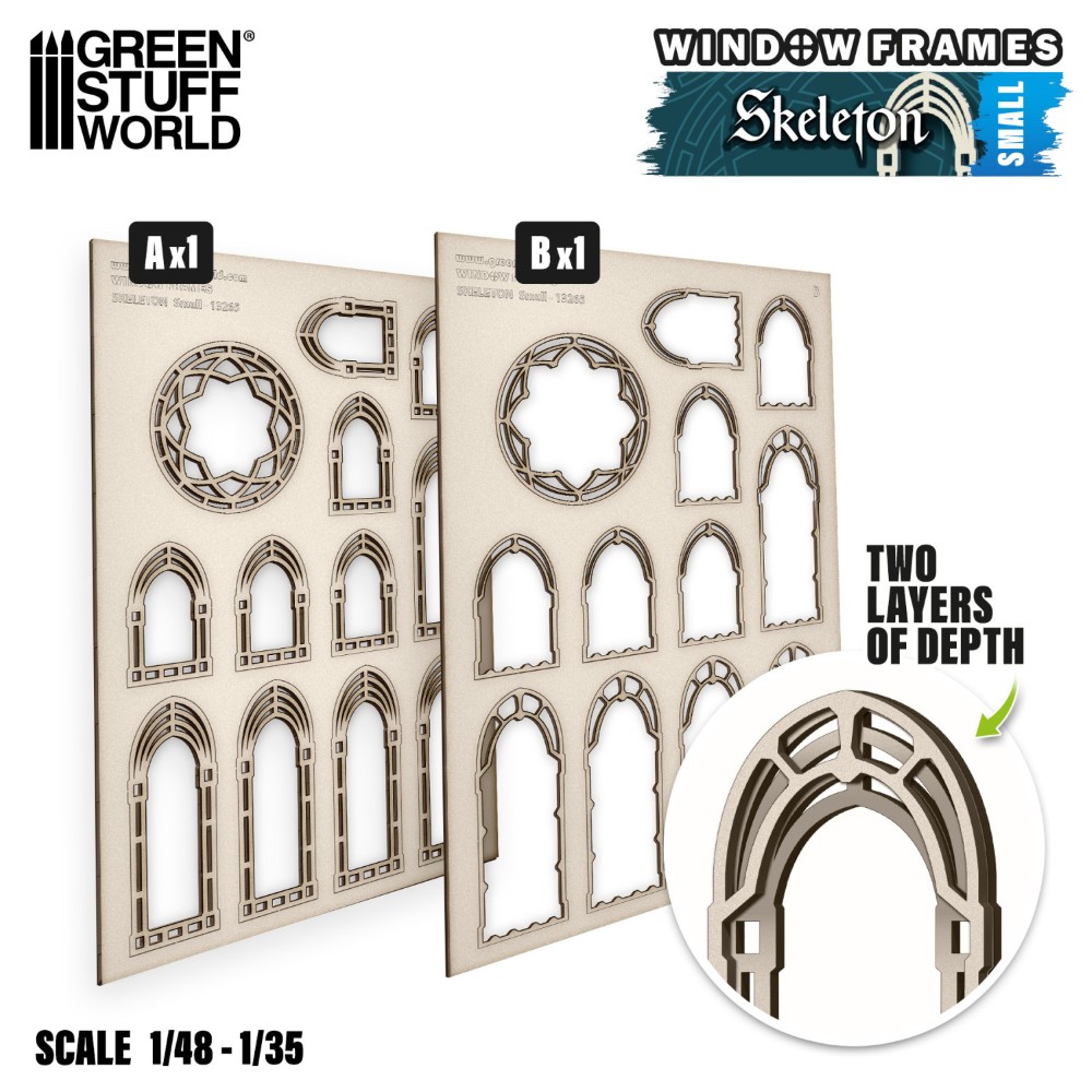 Kis formátumú miniatűr csontváz ablakok horror és sötét fantasy diorámákhoz. Részletesen kidolgozott keretek festéshez és ragasztáshoz, festetlenül szállítjuk.