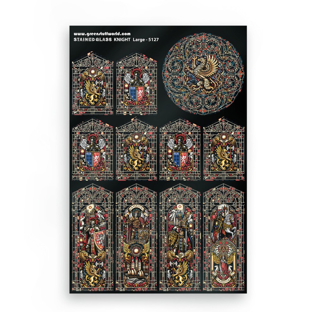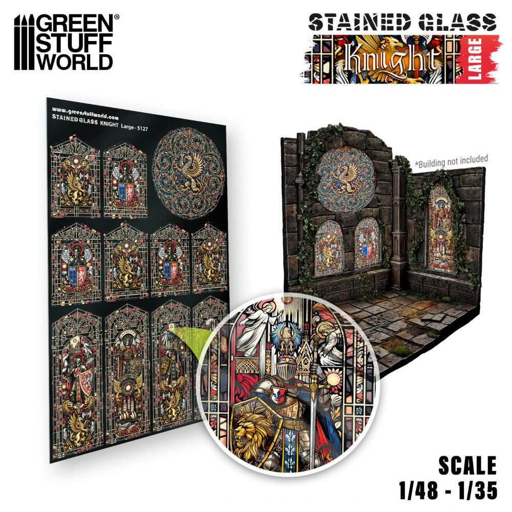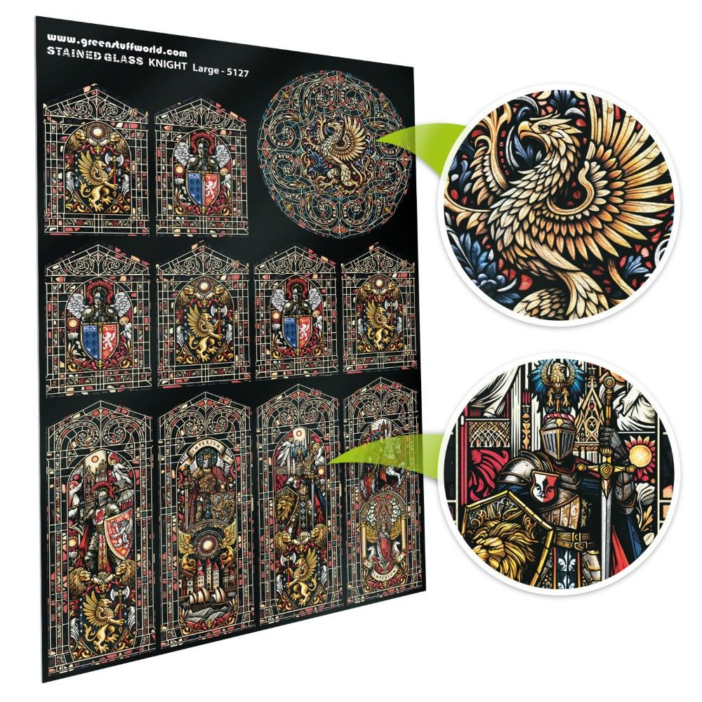 Nagyméretű (150×220 mm) miniatűr lovag ólomüveg figura átlátszó műanyag alapon. A dupla nyomtatás feltűnő hatást biztosít még háttérvilágítás nélkül is, 1/48–1/35 méretarányú diorámákhoz alkalmas.