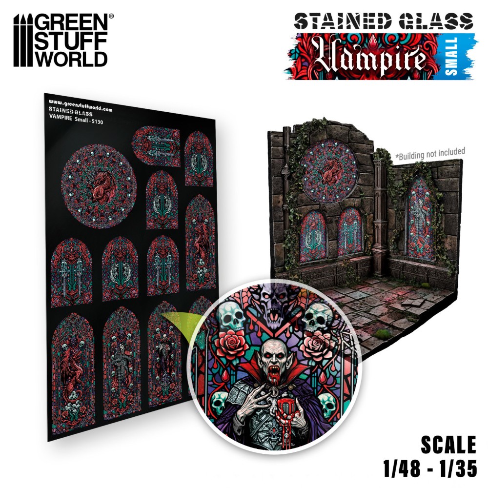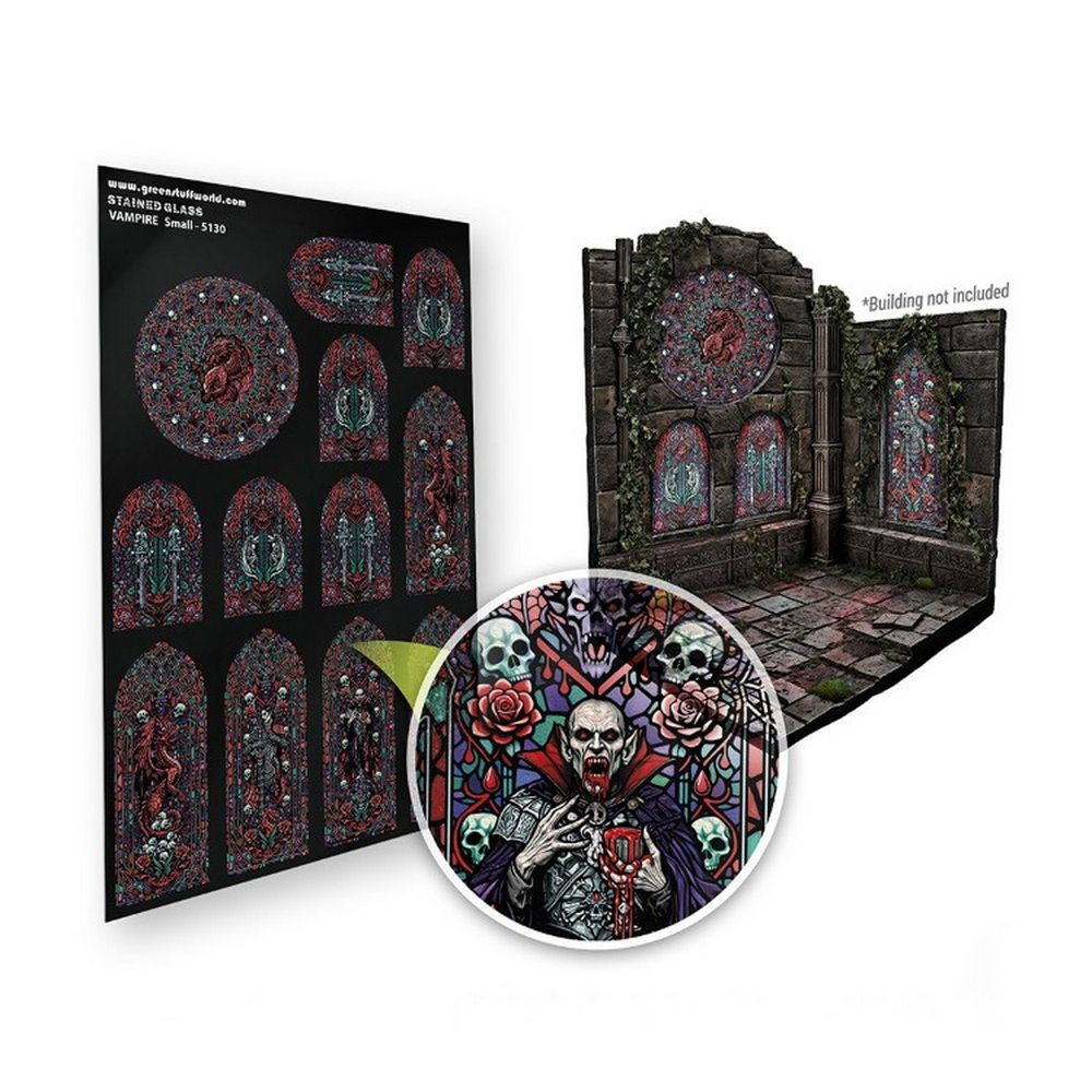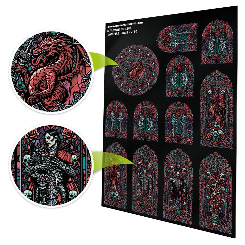 A Kicsi Vámpír Üvegfestmény egy nyomtatott miniatűr ólomüveg figura, amelyet kisebb ablaknyílásokba terveztek diorámákban, babaházakban és részletesen kidolgozott modellekben. A vámpír motívum a gazdag színekkel kombinálva erős sötét fantázia hangulatot teremt.