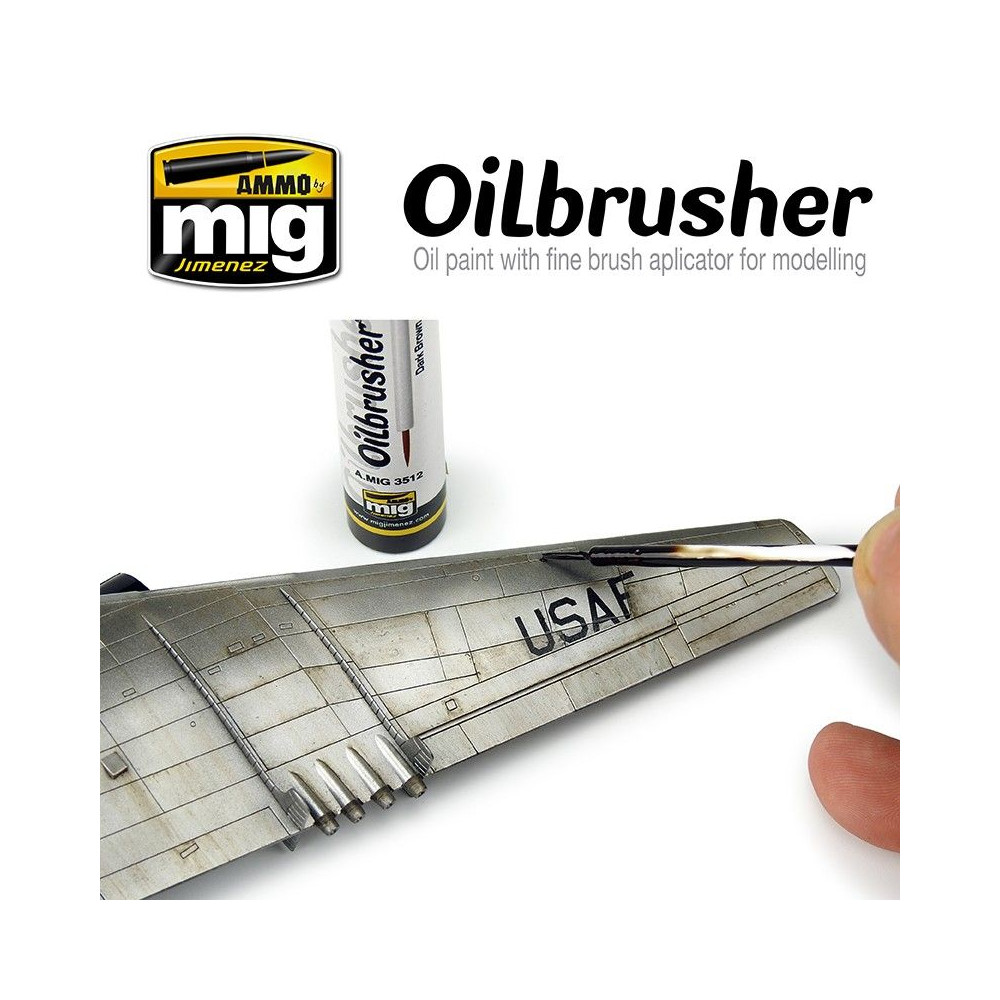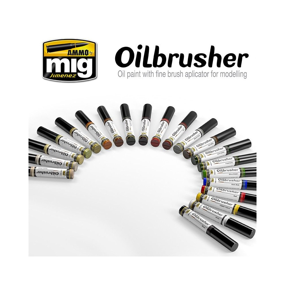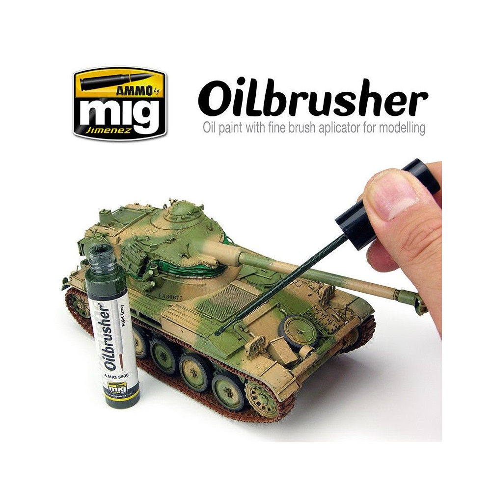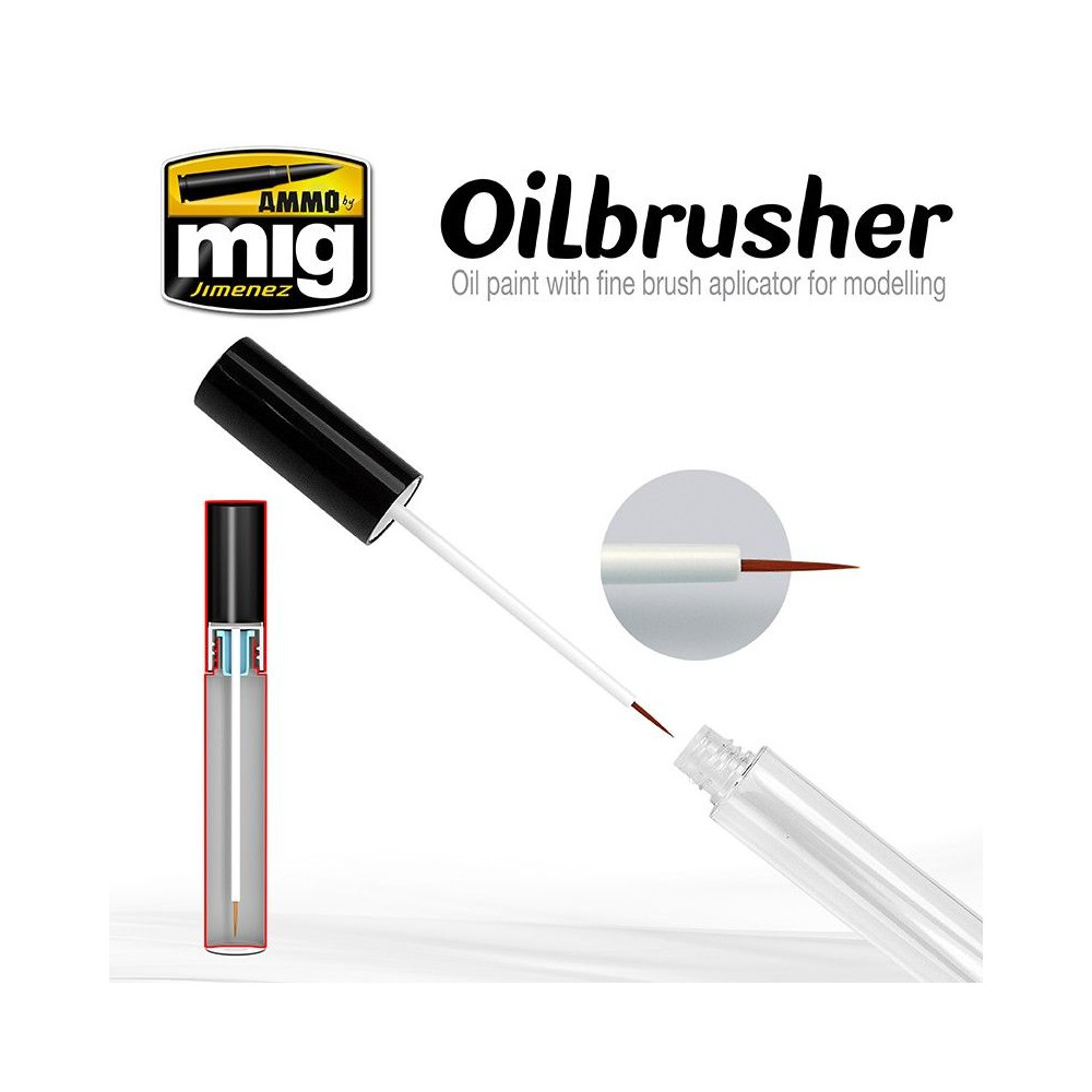 Nový OILBRUSHER je dokonalý a revolučný modelovací produkt. OILBRUSHER obsahuje vysokokvalitnú olejovú farbu špeciálne vyvinutú na modelárske použitie, zriedenú na dokonalú konzistenciu, ktorá sa nanáša priamo z nádobky. Uzáver má exkluzívne zabudovaný vysoko presný štetec na nanášanie farby priamo na model bez toho, aby ste museli olejovú farbu nanášať na paletu alebo kus kartónu. Tento vývoj zabraňuje vysychaniu oleja a zbytočnému plytvaniu produktom. Moderná nádoba navyše obsahuje systém dávkovača-čističa, ktorý odstraňuje prebytočnú farbu zo štetca a ponecháva v špičke len správne množstvo. Tradičné tuby na olejovú farbu boli neporiadne a ťažko sa otvárali, keď olejová farba zaschla okolo uzáveru a spôsobila jeho zaseknutie. To sa pri OILBRUSHER nestáva, je vždy čistý a stabilný. Okrem všetkých týchto výhod tento revolučný dizajn z dlhodobého hľadiska šetrí aj výrobok a náklady, najmä ak vezmeme do úvahy, že OILBRUSHER je lacnejší ako tradičné olejové farby na trhu.