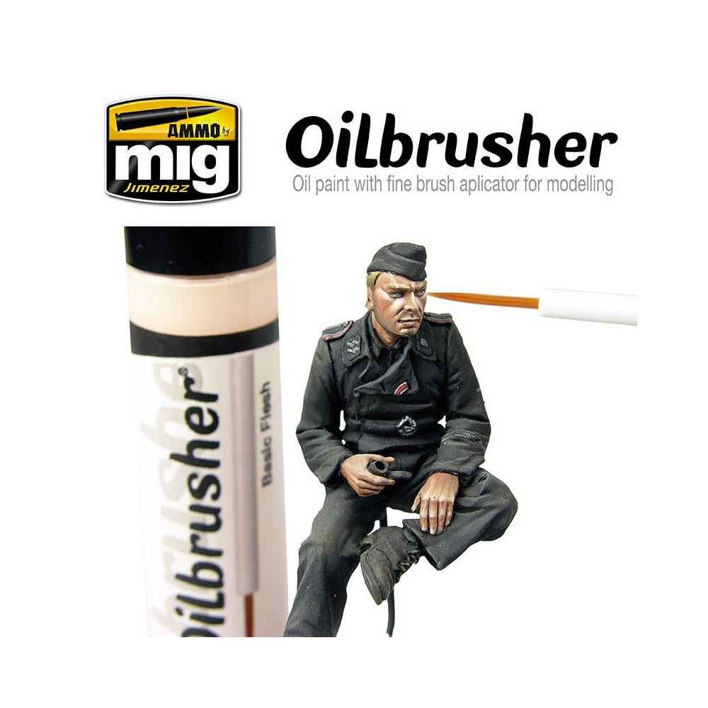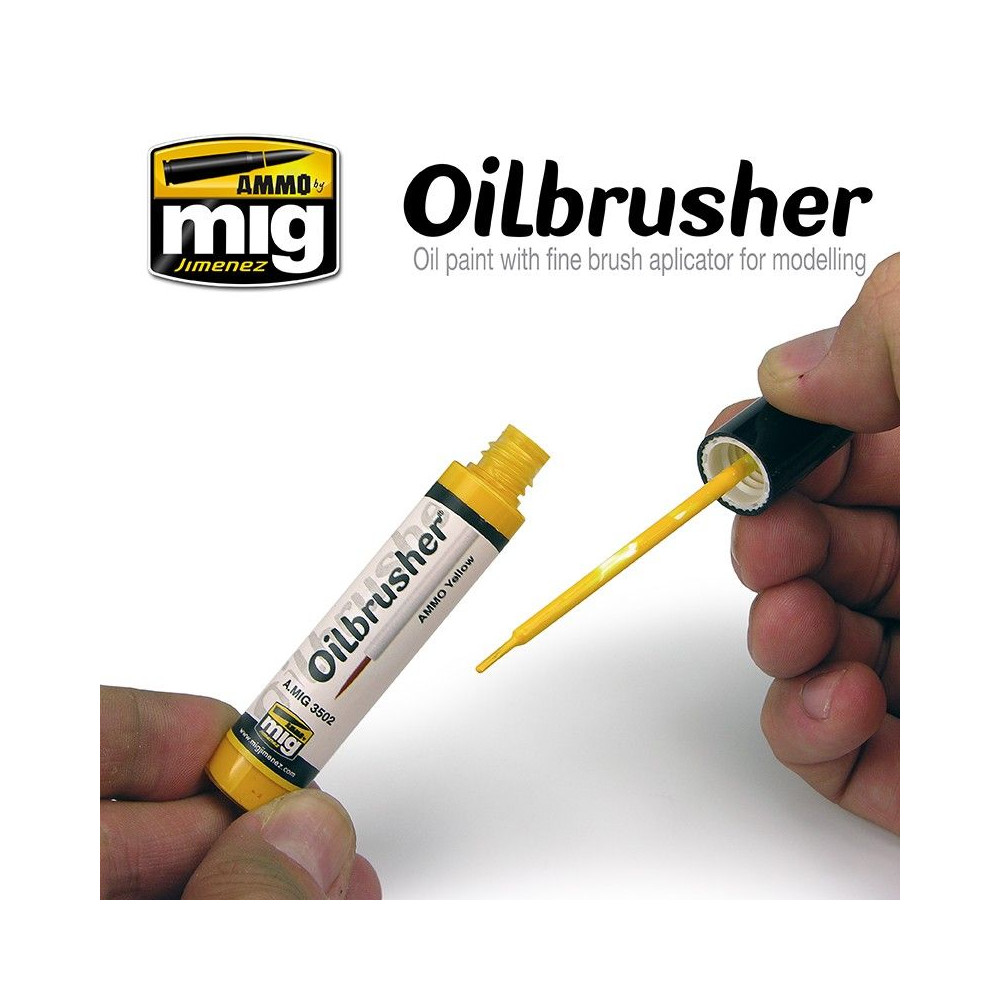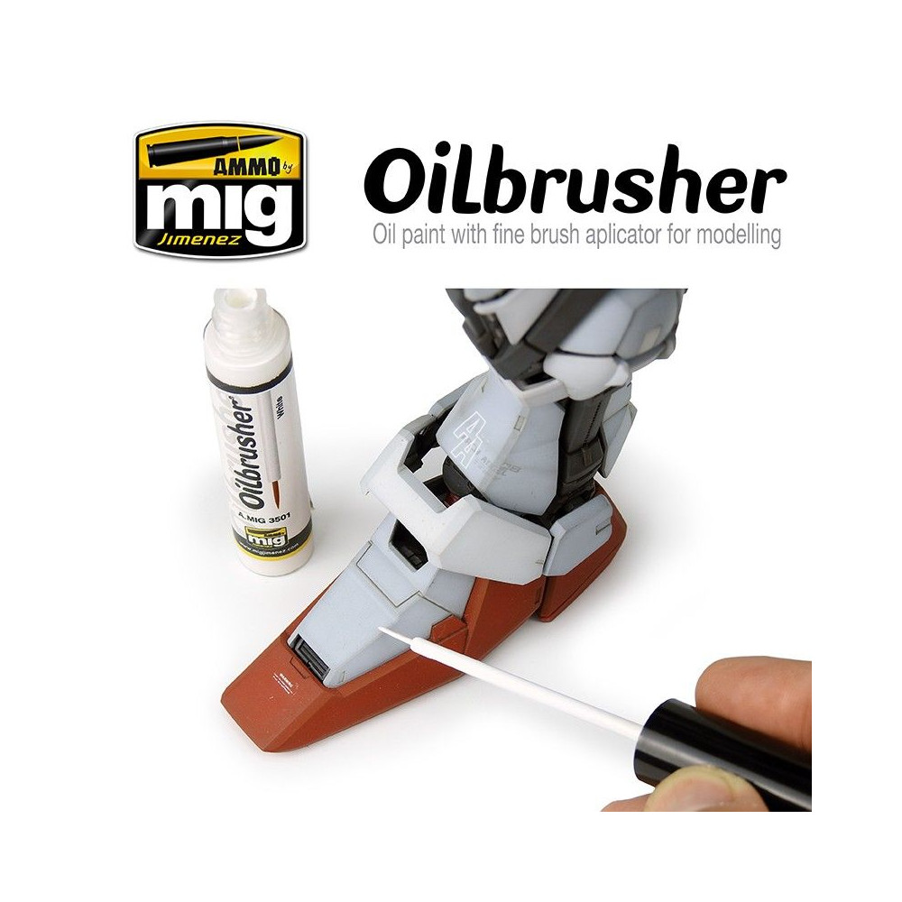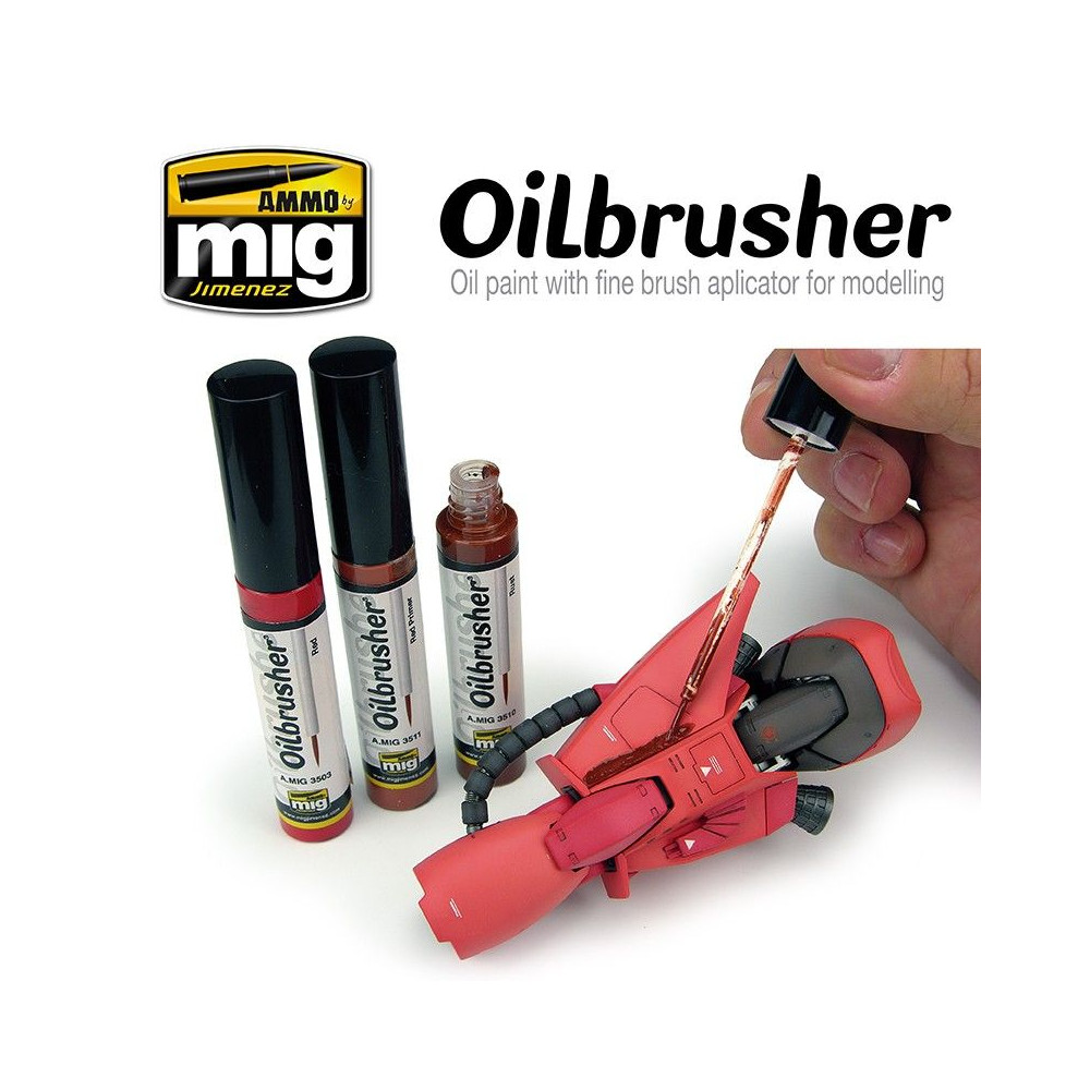 Nový OILBRUSHER je dokonalý a revolučný modelovací produkt. OILBRUSHER obsahuje vysokokvalitnú olejovú farbu špeciálne vyvinutú na modelárske použitie, zriedenú na dokonalú konzistenciu, ktorá sa nanáša priamo z nádobky. Uzáver má exkluzívne zabudovaný vysoko presný štetec na nanášanie farby priamo na model bez toho, aby ste museli olejovú farbu nanášať na paletu alebo kus kartónu. Tento vývoj zabraňuje vysychaniu oleja a zbytočnému plytvaniu produktom. Moderná nádoba navyše obsahuje systém dávkovača-čističa, ktorý odstraňuje prebytočnú farbu zo štetca a ponecháva v špičke len správne množstvo. Tradičné tuby na olejovú farbu boli neporiadne a ťažko sa otvárali, keď olejová farba zaschla okolo uzáveru a spôsobila jeho zaseknutie. To sa pri OILBRUSHER nestáva, je vždy čistý a stabilný. Okrem všetkých týchto výhod tento revolučný dizajn z dlhodobého hľadiska šetrí aj výrobok a náklady, najmä ak vezmeme do úvahy, že OILBRUSHER je lacnejší ako tradičné olejové farby na trhu.