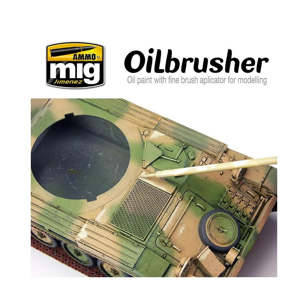 Farebná škála OILBRUSHER zahŕňa najbežnejšie odtiene používané v maketách, čím sa predchádza zbytočným tónom, ktoré by inak zostali väčšinou nevyužité na lavici. Maľovanie olejovými farbami ešte nikdy nebolo také zábavné a jednoduché. OILBRUSHER je vaša olejová farba so zabudovaným aplikačným štetcom; jedinečný a exkluzívny produkt AMMO.